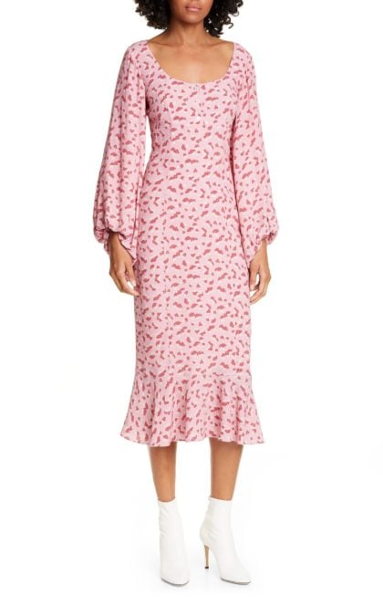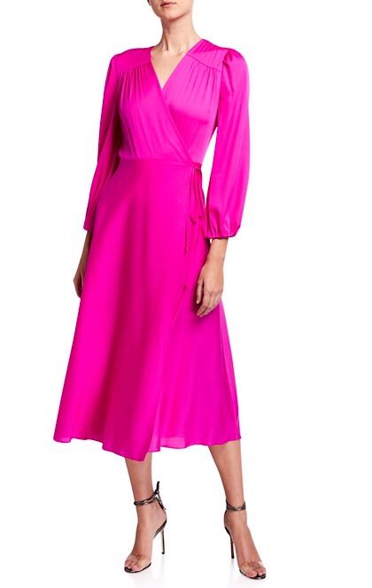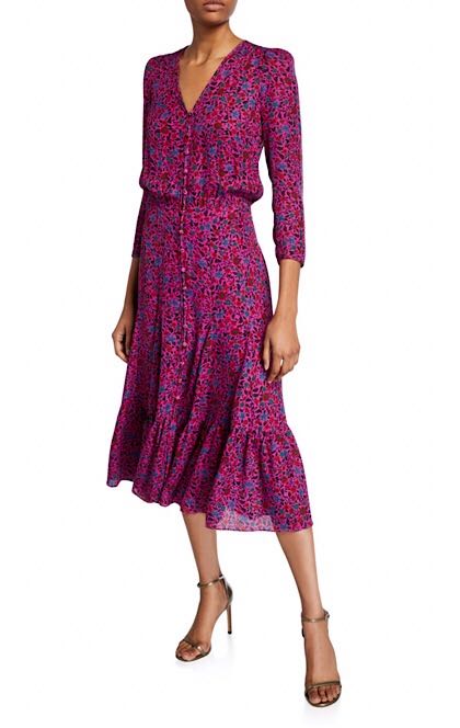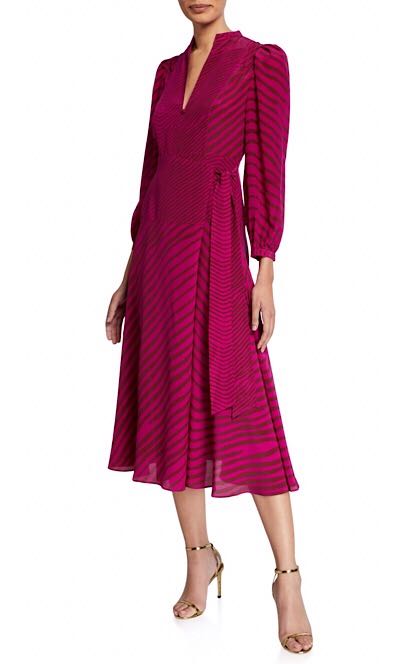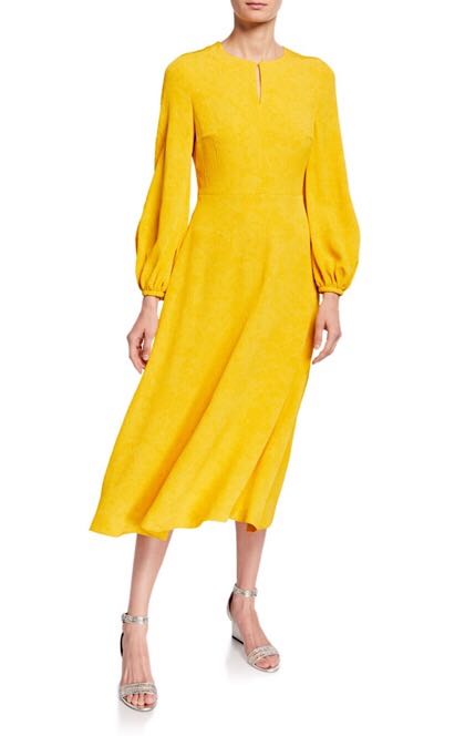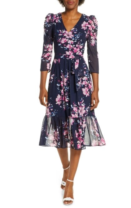[shop_product num=”1″ image=”left”] [shop_product num=”2″ image=”left”]Here, I’m wearing Veronica Beard’s Selena floral-print stretch-silk midi dress (conveniently marked down by 30% by the way!). It’s a slim fitting sheath made of mid-weight stretchy fabric, so you know you’ll be comfortable throughout the event without looking overly casual or slouchy. The ruching at the waist makes it amazingly forgiving and the leg slit gives it serious style points without feeling too “sexy” for a daytime, family affair.