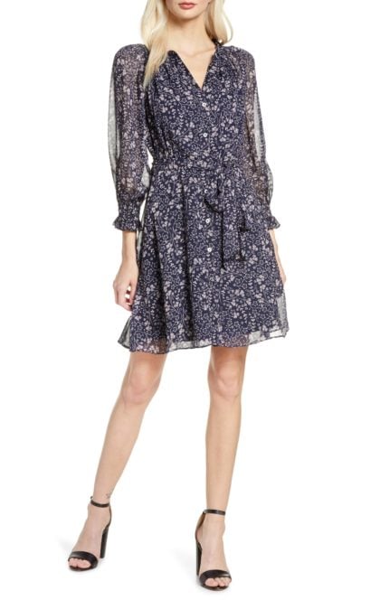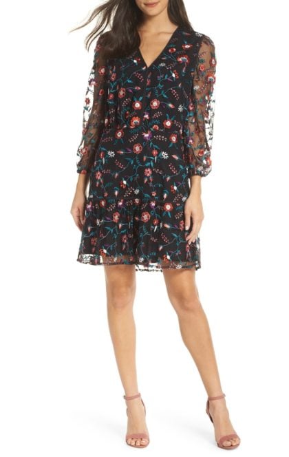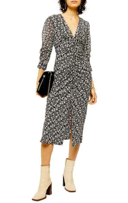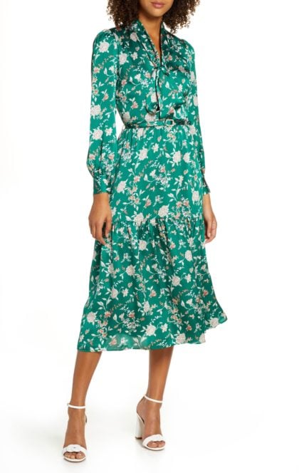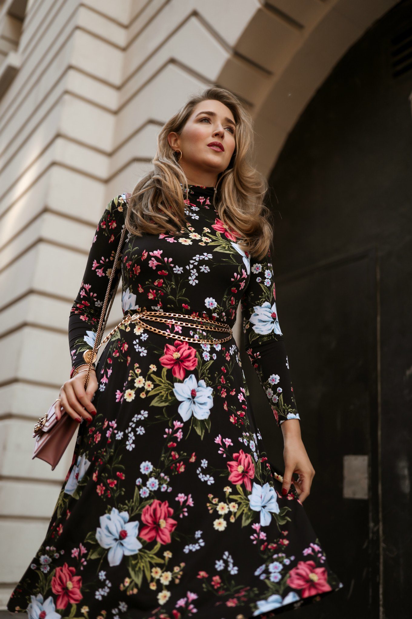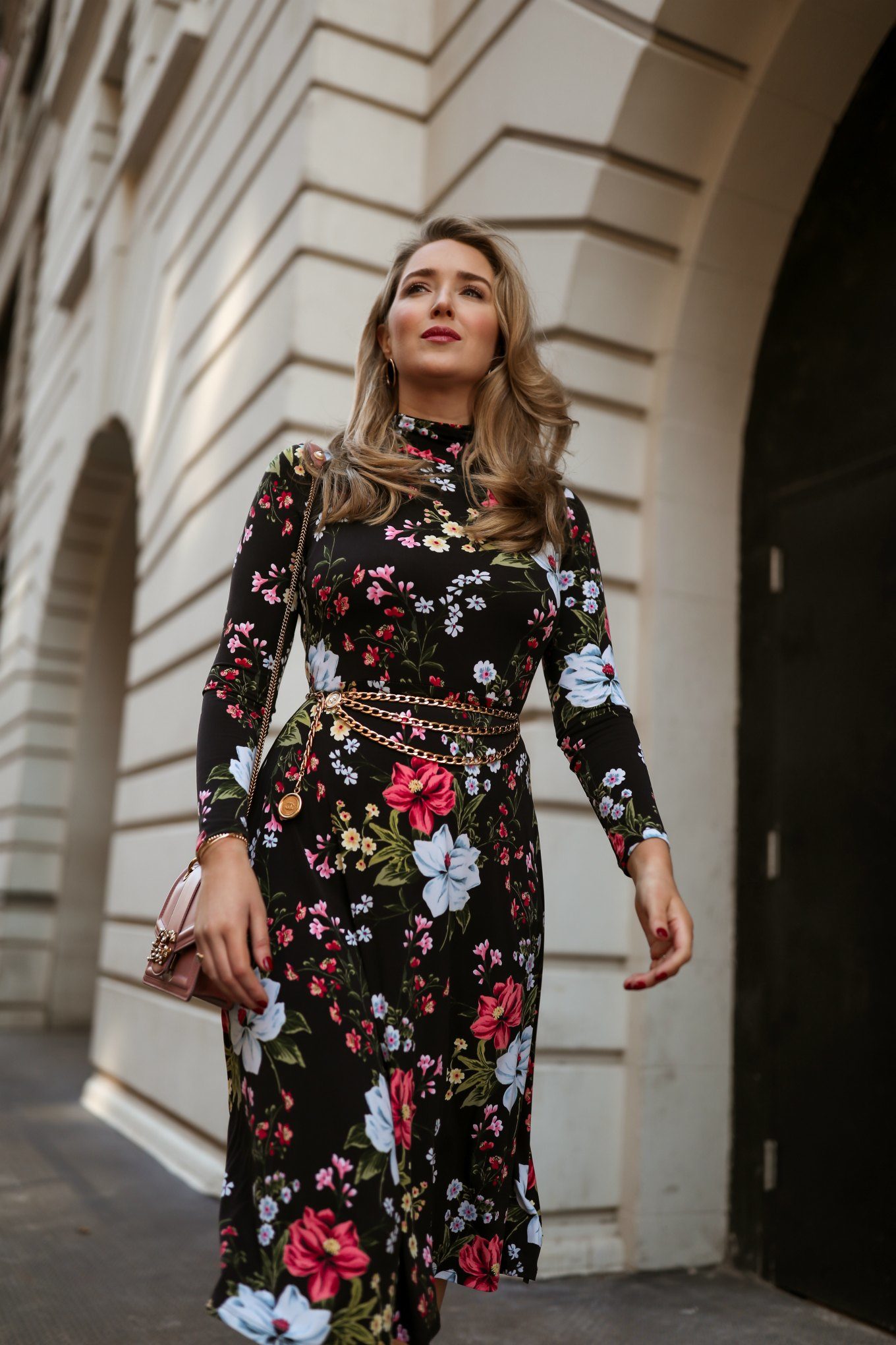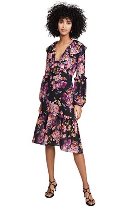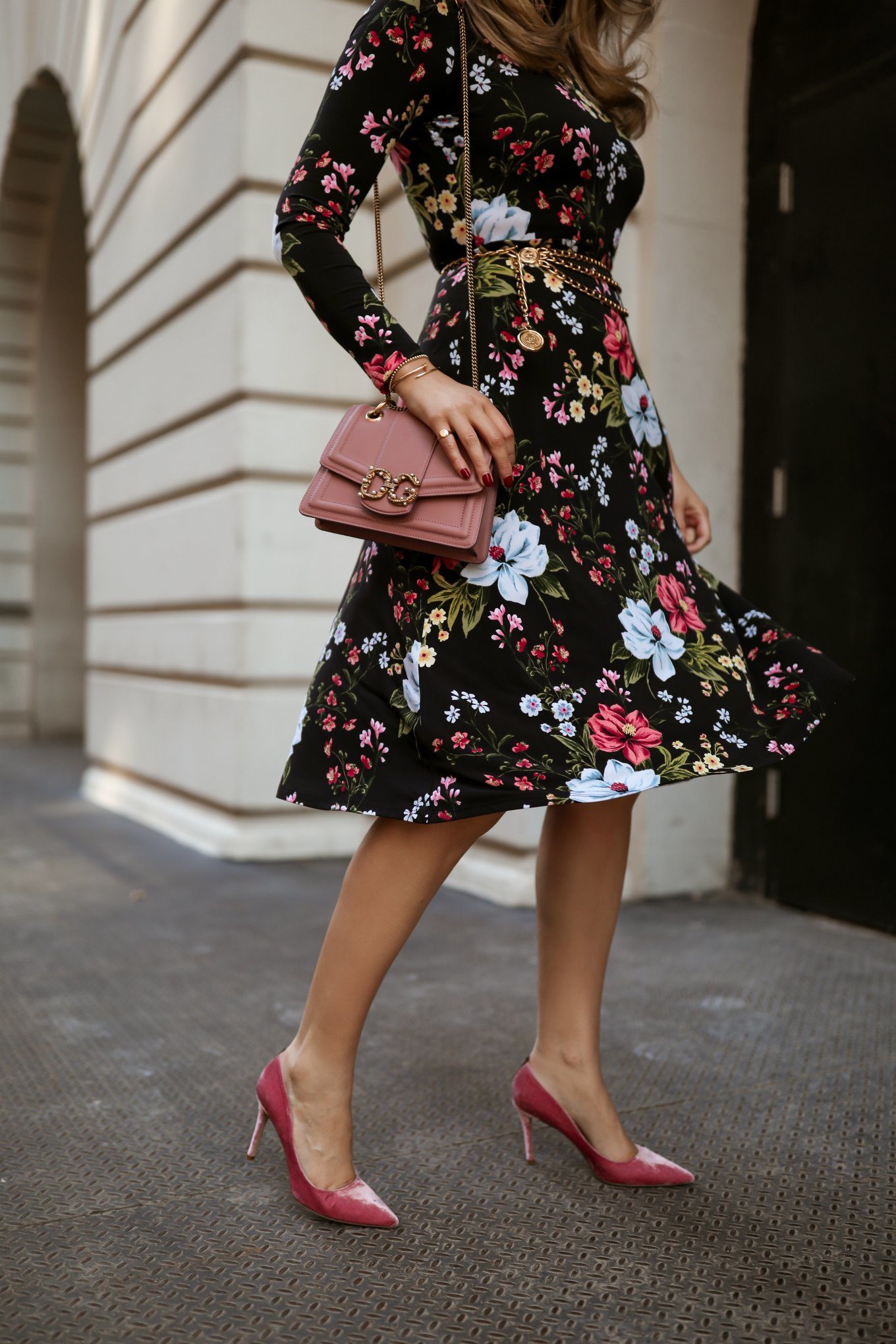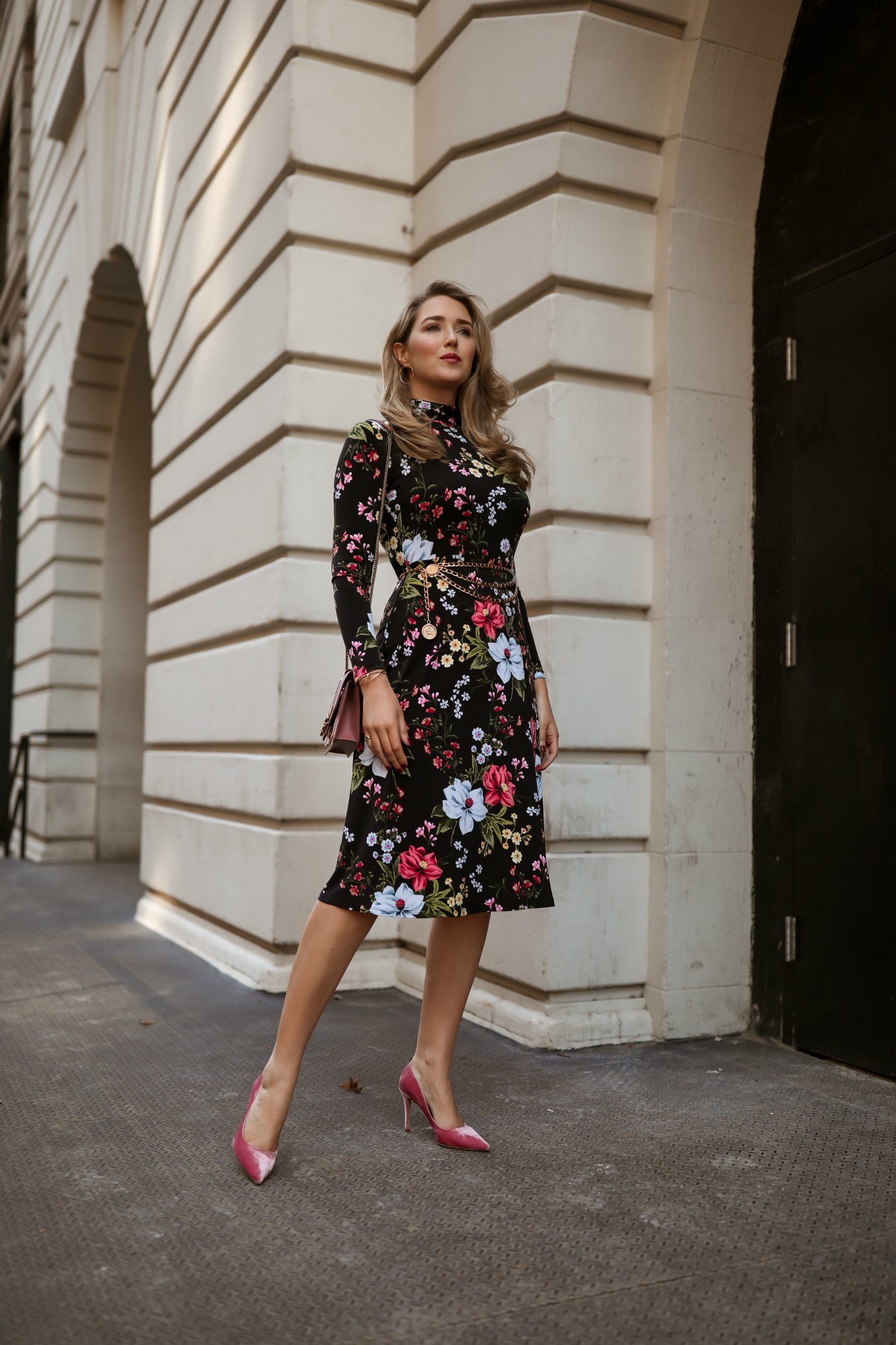 The reason this floral works for winter is its background. The dark, inky canvas gives great support to the delicate pastel shades of the florals, and gives the entire dress a tone that’s not too spring-y. There are a number of colors in this print to play with in terms of accessories, but pink is standing out to me as the one that gives the look the most chic, feminine complement.
