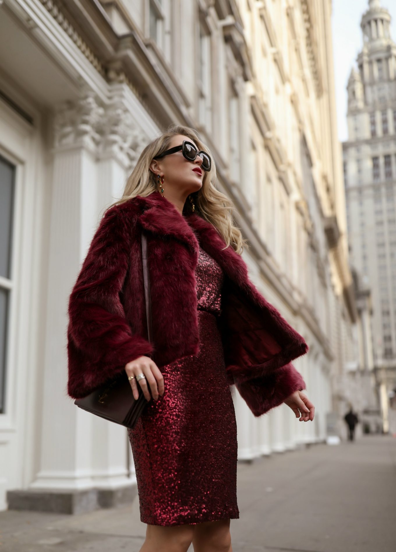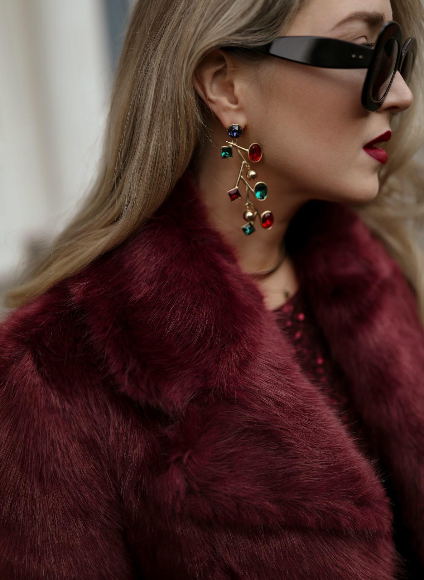 I’ve styled this dress with two other pieces from Rent The Runway Unlimited which is monumentally convenient while caring for an actual infant, wrapping gifts, running a household, and having a day job, to say nothing of a social life. Honestly, even my Google Calendar has put in for its own vacation days. First, I’m accenting the dress with festive statement earrings in jewel tones by Kenneth Jay Lane, and because I’d prefer not to freeze solid, I’m topping off the look with the burgundy Faux Fur Madam Butterfly Jacket by Unreal Fur.