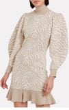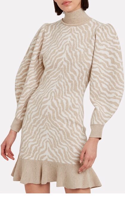 This dress, the Joni Zebra Jacquard Knit Dress by Ulla Johnson (love Ulla), is made of a zebra jacquard merino wool and finished with a cozy turtleneck. My two favorite features of this dress are as follows: Hello, flounce ruffle hem, nice to meet you! It’s really hard to be in a bad mood in a ruffle, don’t you think? Add to that a subtle sleeve poofiness (poofiness is a word, I’ve consulted the authorities), and this sweater dress is packed with enough shape and style to lay any fears of boxiness or boredom to rest. I also love that the color palette here really allows the zebra print to be a neutral, which is no easy task.