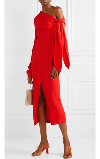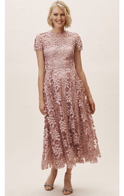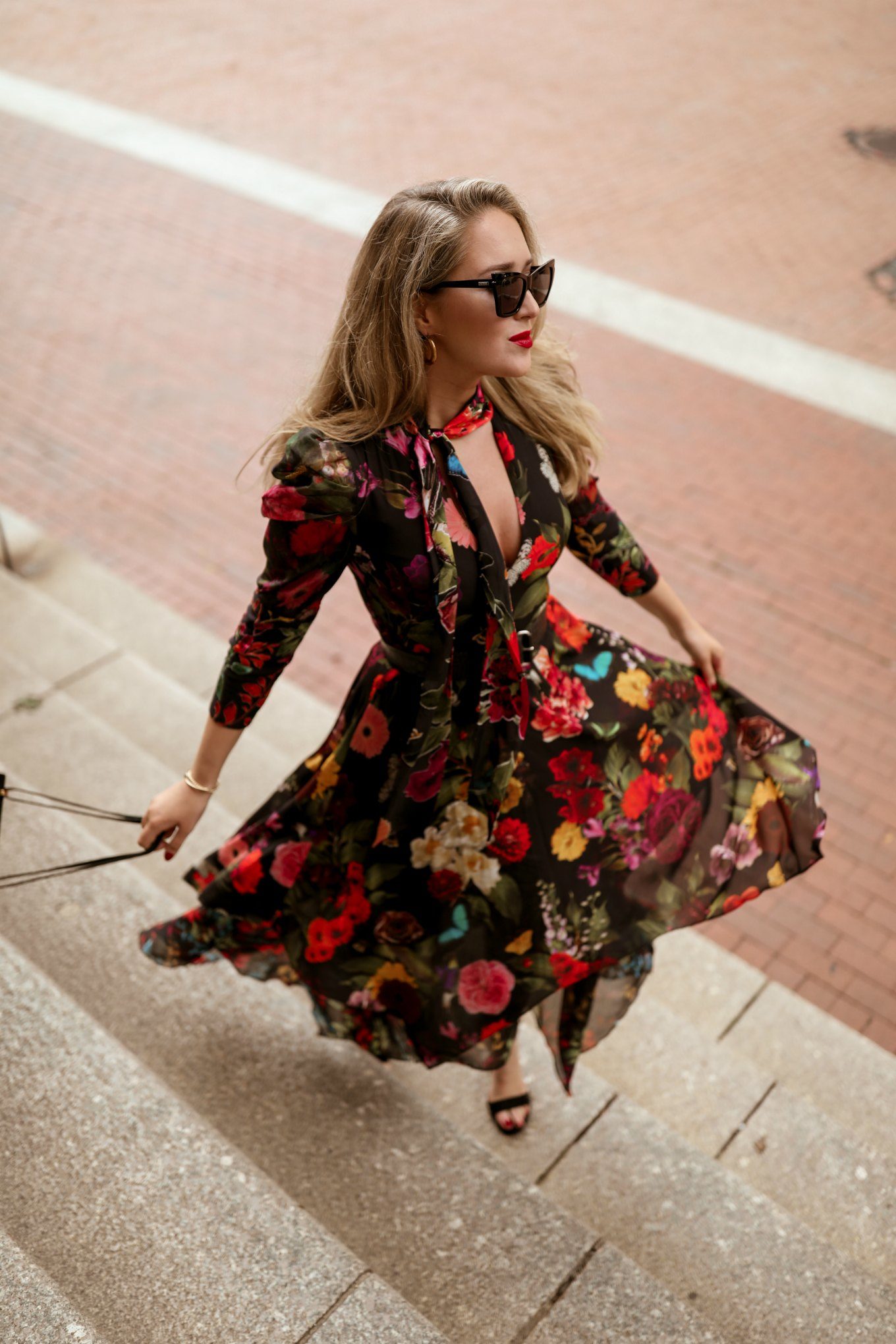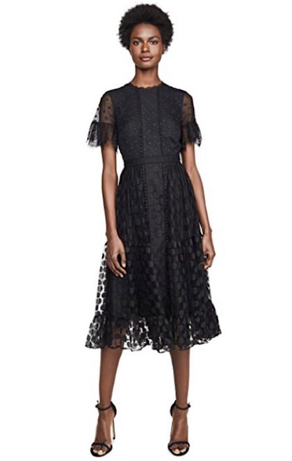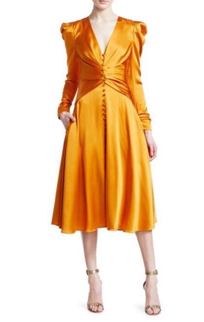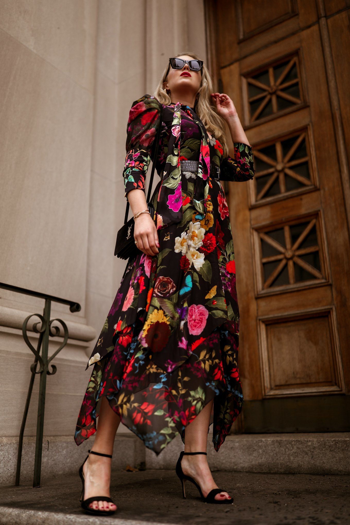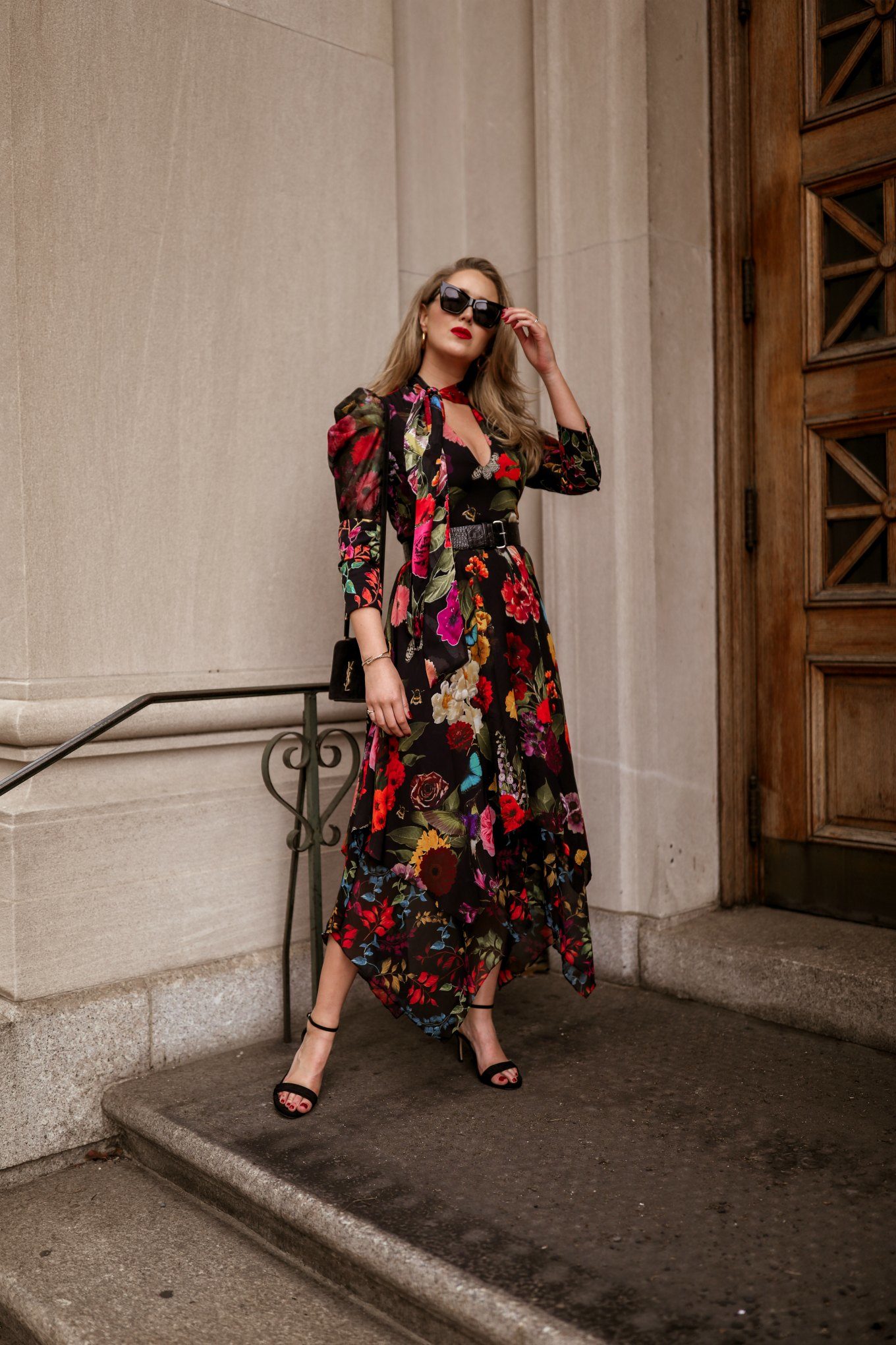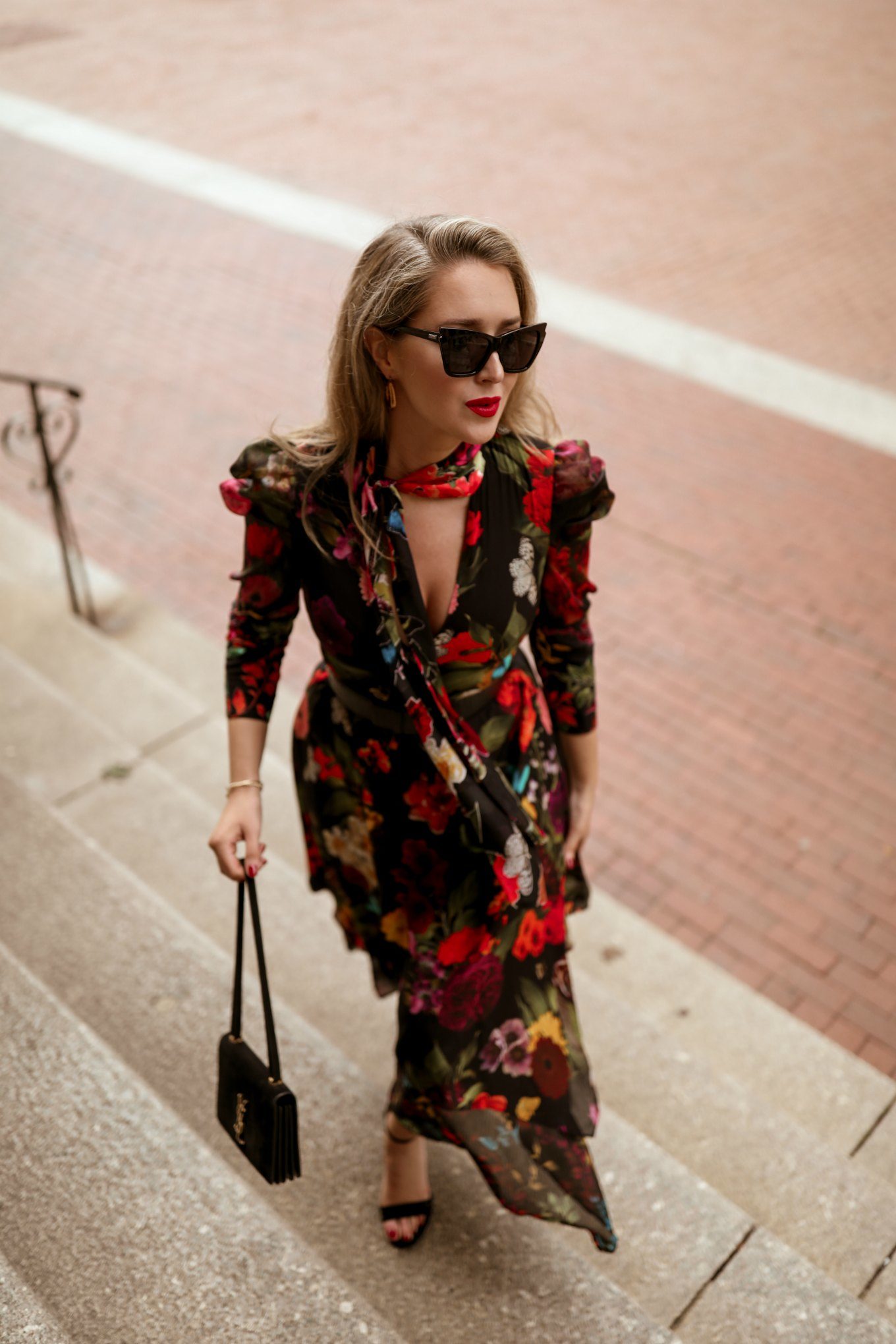 This is the Karen Floral Puff Sleeve Handkerchief Midi Dress by Alice + Olivia. It has a tie neck, puffed sheer shoulders, and we call a hem with this kind of drama a handkerchief hem. Which honestly doesn’t sound fancy enough but I’ll speak to the authorities.