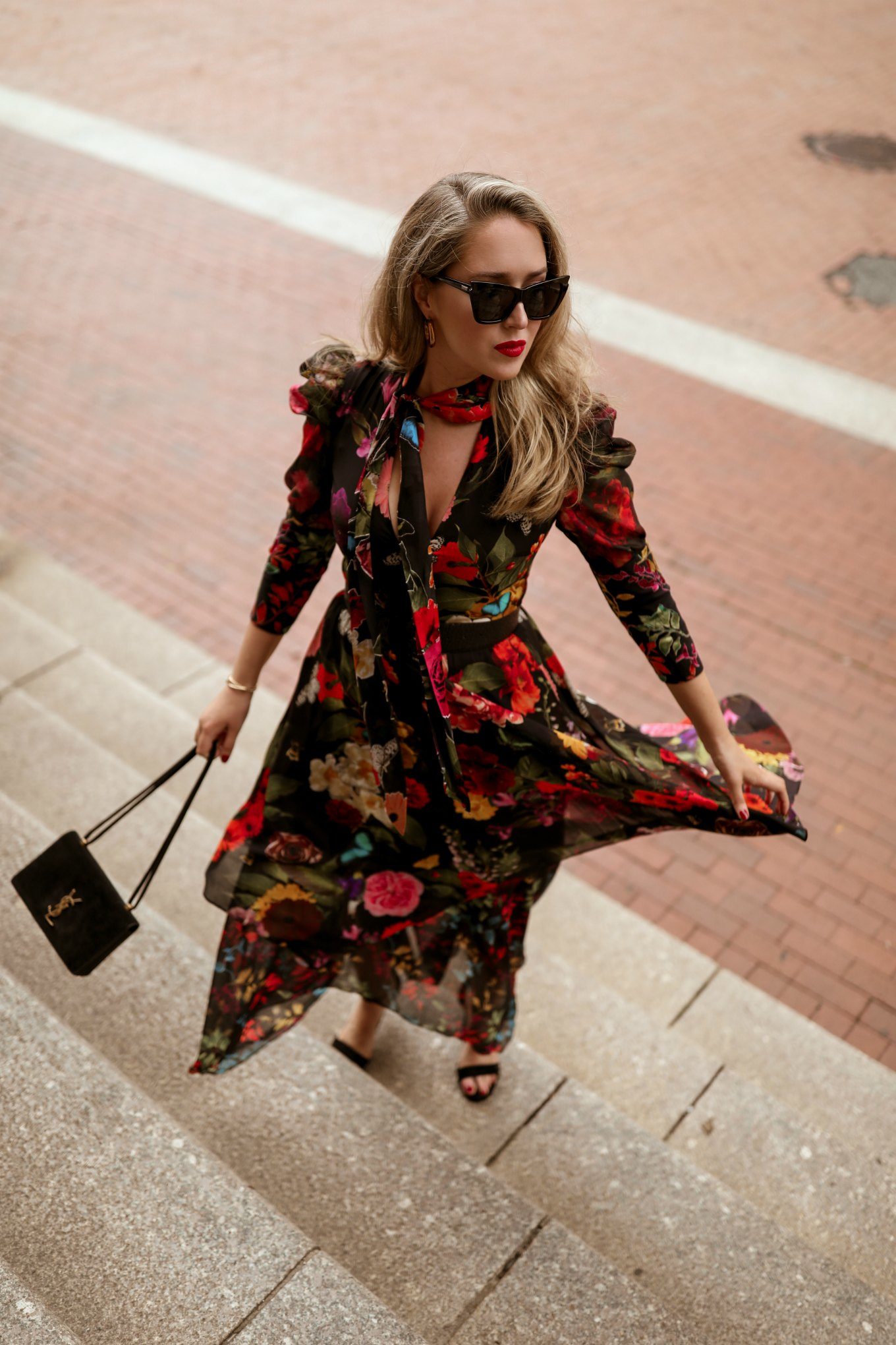 With so much happening as far as the dress goes, you can feel confident styling the rest of your look simply. Your go-to black pumps or sandals will work really well, and feel free to carry your favorite classic black evening bag. I’ve come to rely on my YSL for so many things, and it’s perfect here. I’ve belted the dress with a black croc embossed waist belt just to add a little cinching, but with this dress it’s not entirely mandatory.