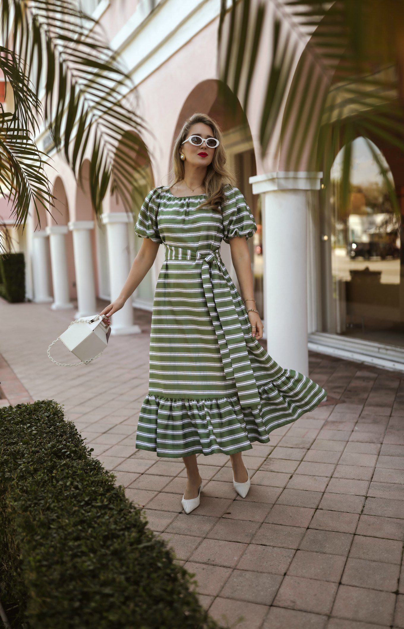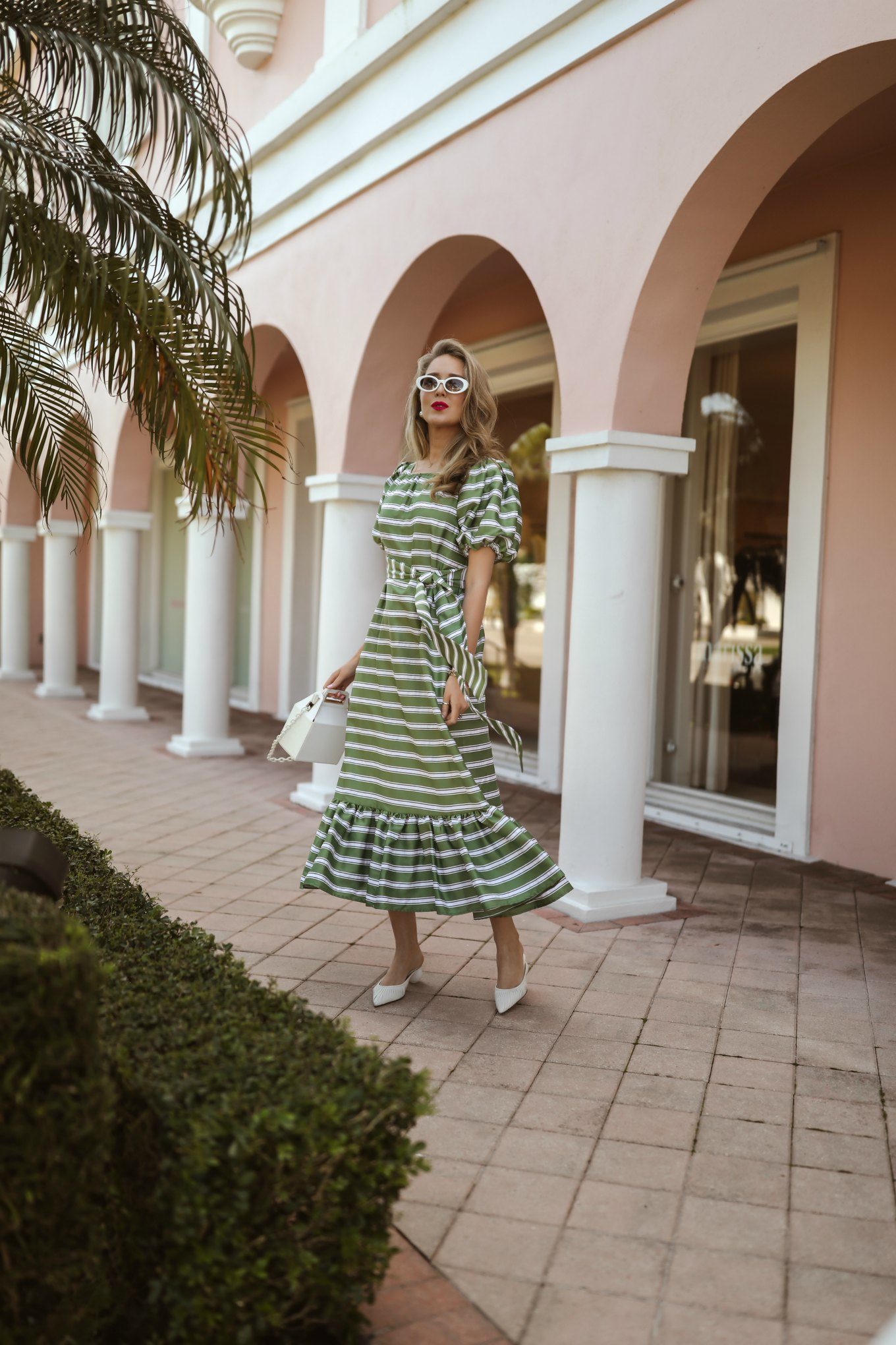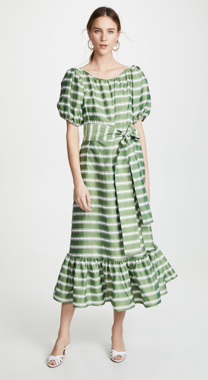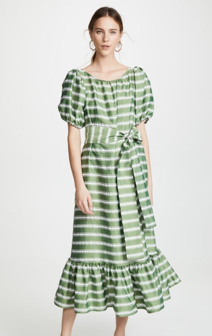 This impossibly fun striped number by Lisa Marie Fernandez is exactly the kind of transportative look I need. It’s perfect for when I’m feeling like there’s way too much standing in between me and Memorial Day. It’s optimistic color and bold pattern are an instant mood lifter. So is the margarita you order while wearing it, just FYI. If ever a dress mastered “beach umbrella chic,” it’s this one.