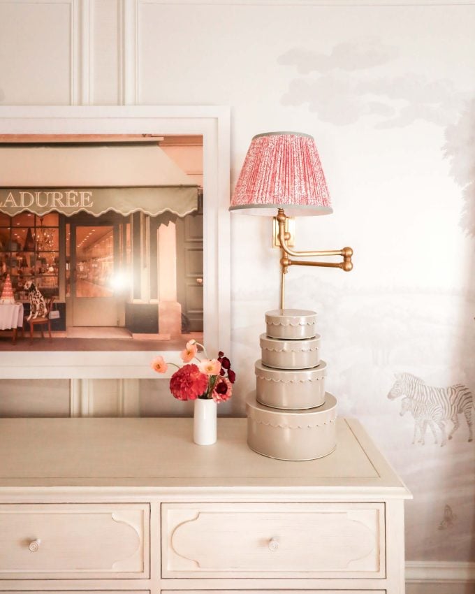 WALL SCONCE LAMP NEXT TO LADUREE ART: Visual Comfort Pimlico Swing Arm with custom lampshade made with Casabranca Jaipur Paisley fabric in Coral/Salmon and Samuel & Sons Cambridge Strie Braid trim in Jade.