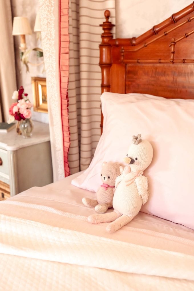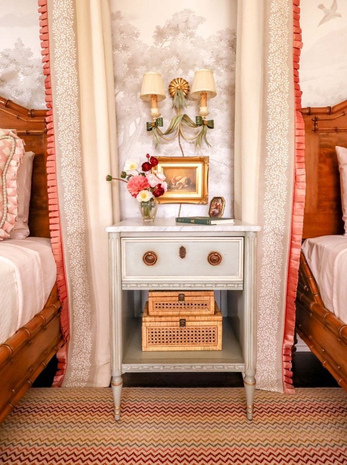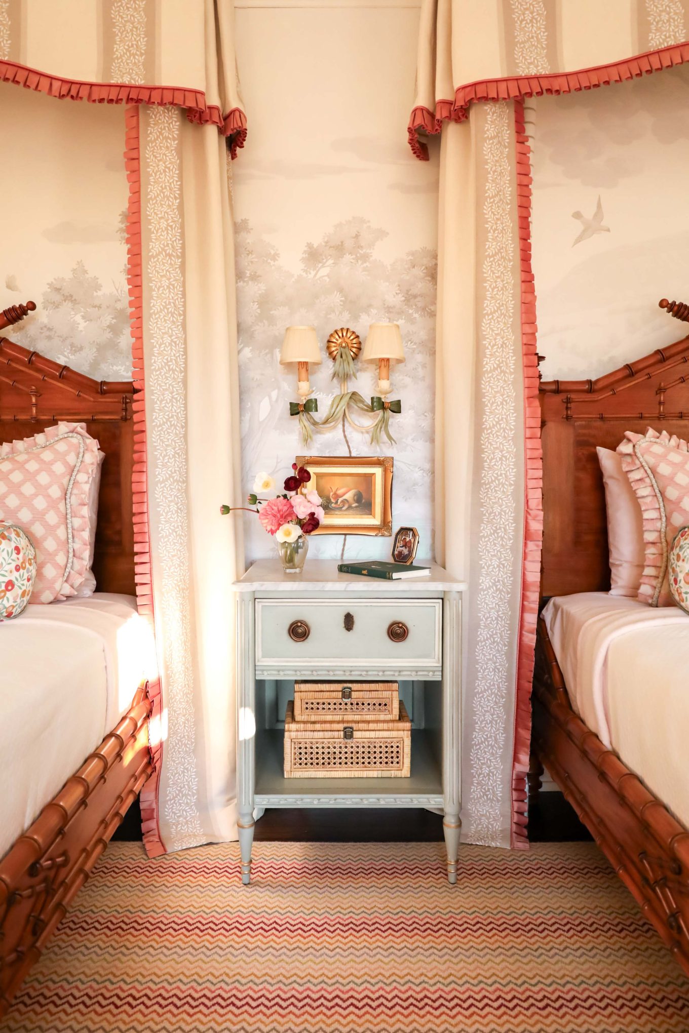 BED VALANCES AND WINDOW DRAPERIES: Calico Corners, with Colby Stripe in Beige as the main body fabric, Vern Yip Zeppole in Ivory as the lining fabric, and Algardi Silk in Petal for the box pleated ruffle on the leading edge.