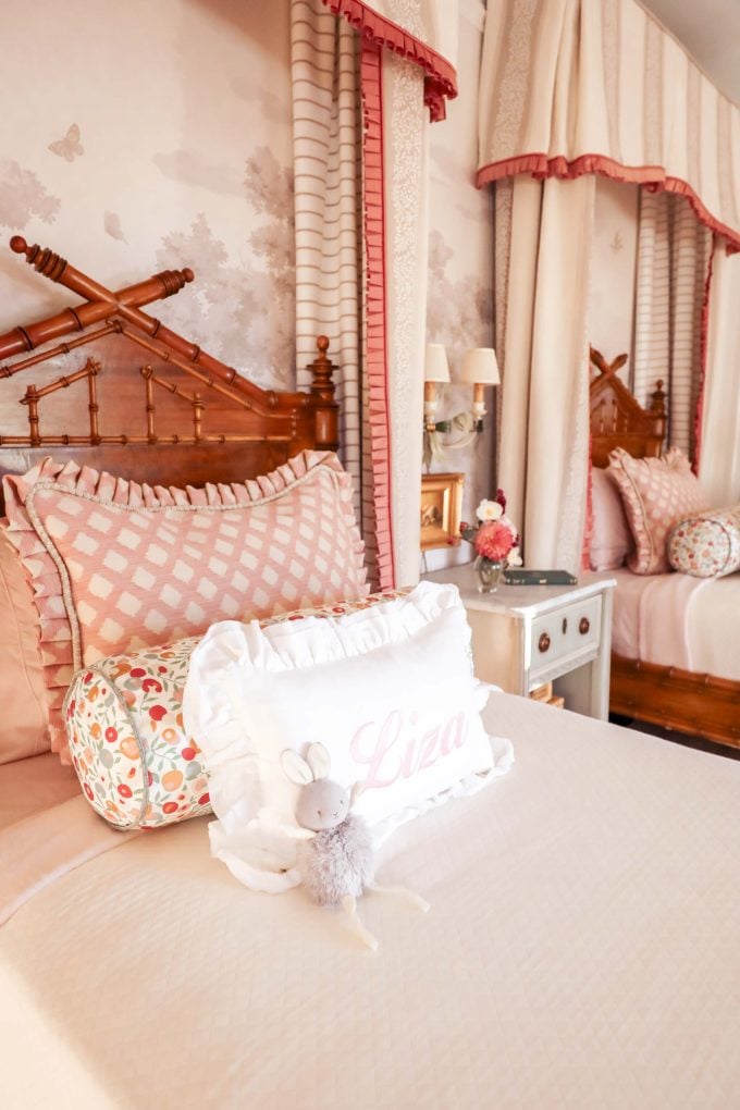 END OF BED BENCHES, THROW PILLOW AND BOLSTERS: These pieces were all custom made and covered in Liberty London Wiltshire Blossom Landsdowne Lichen