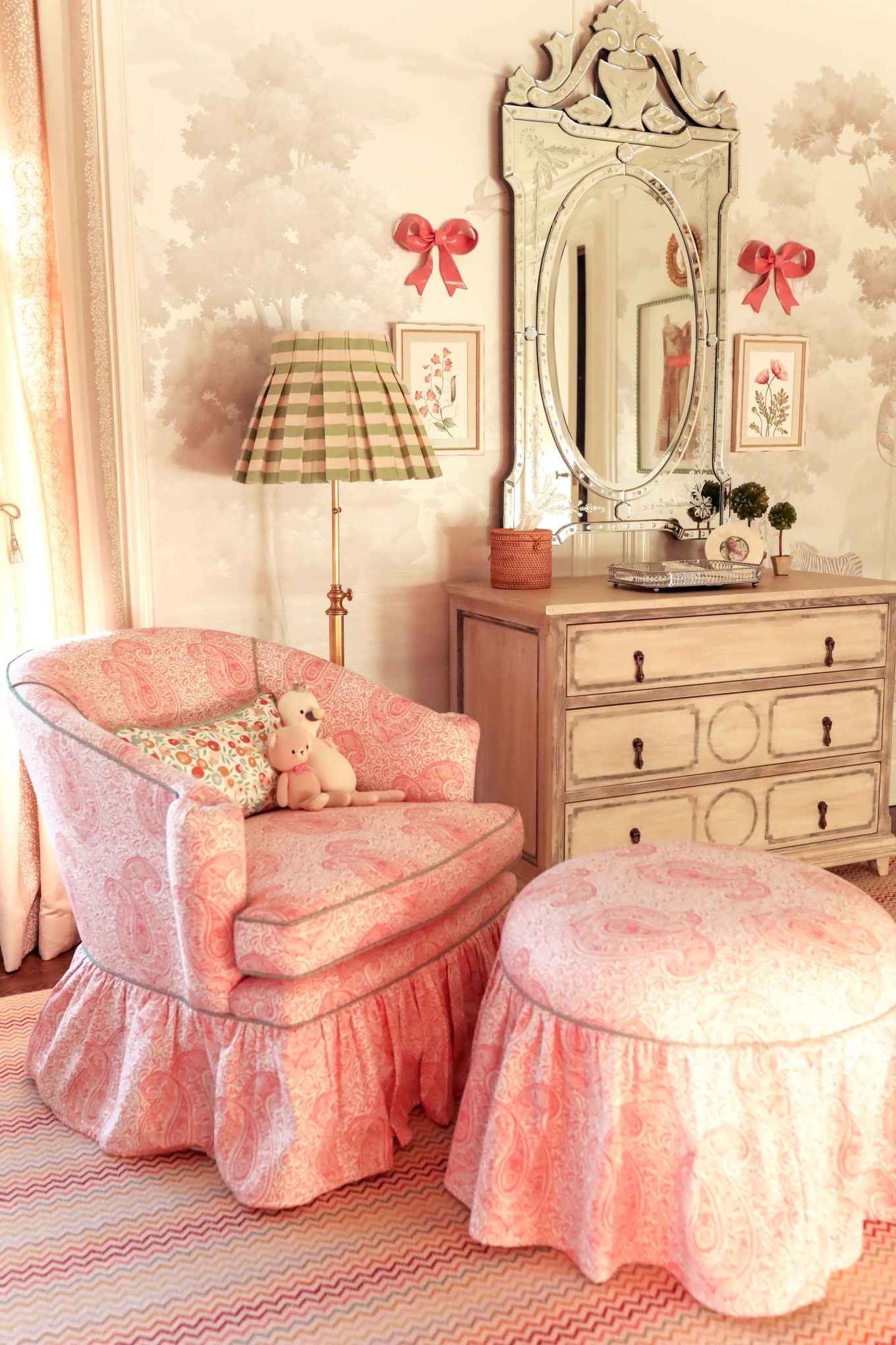 SWIVEL GLIDER ARMCHAIR AND OTTOMAN: These furniture pieces were custom and covered in Casabranca Jaipur Paisley fabric in Coral/Salmon with welting of Samuel & Sons Francoise Cord Tape in Jade