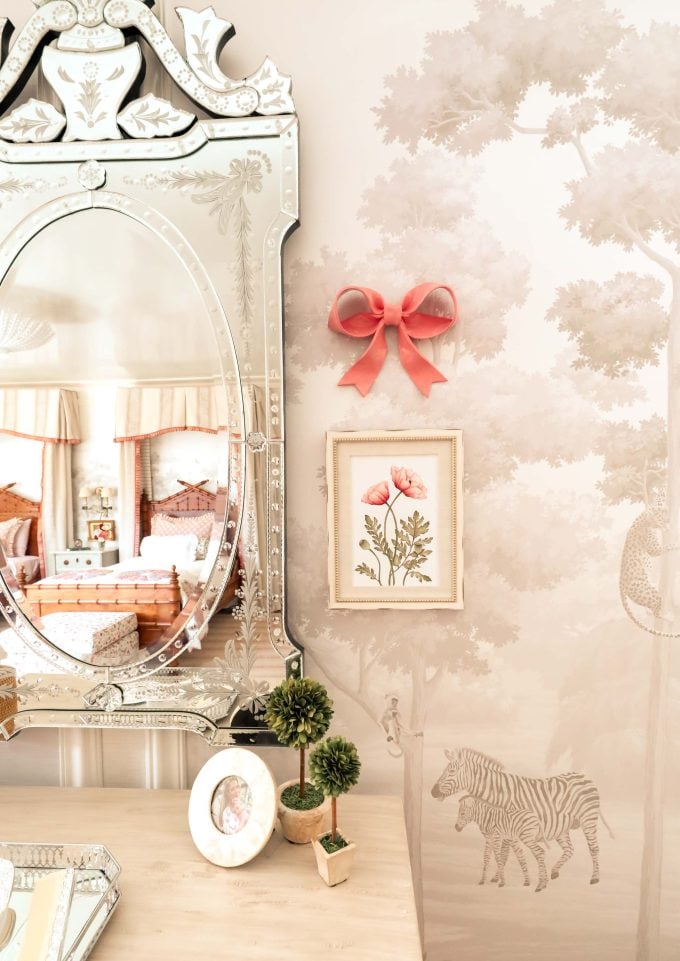 WALLPAPER: Fromental Safari Wallcovering in Fawn (from their collaboration with Sophie Patterson) and around the picture-frame molding is Thibaut Como Silk in Off White