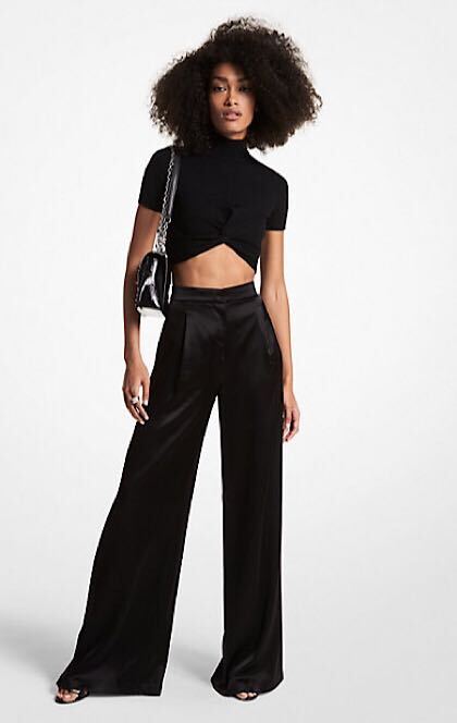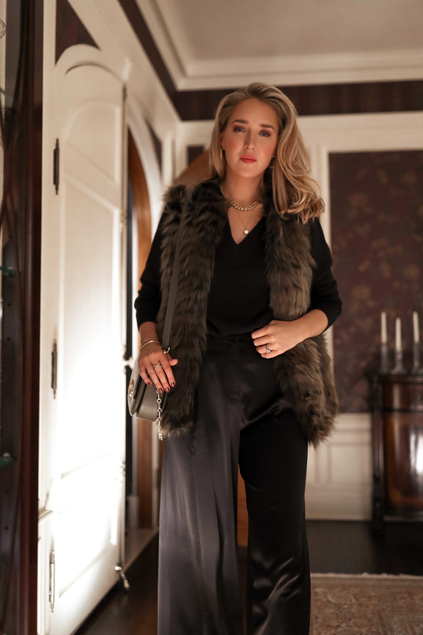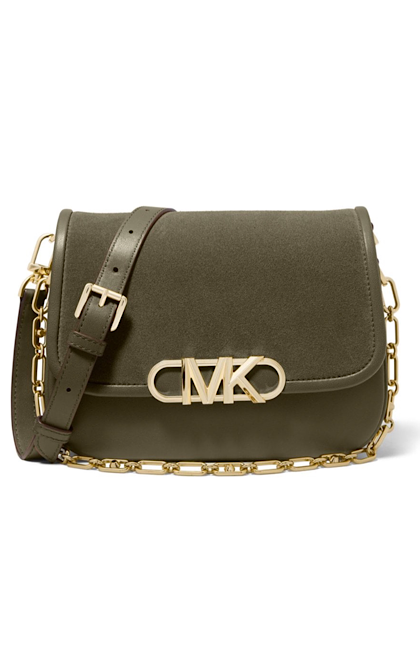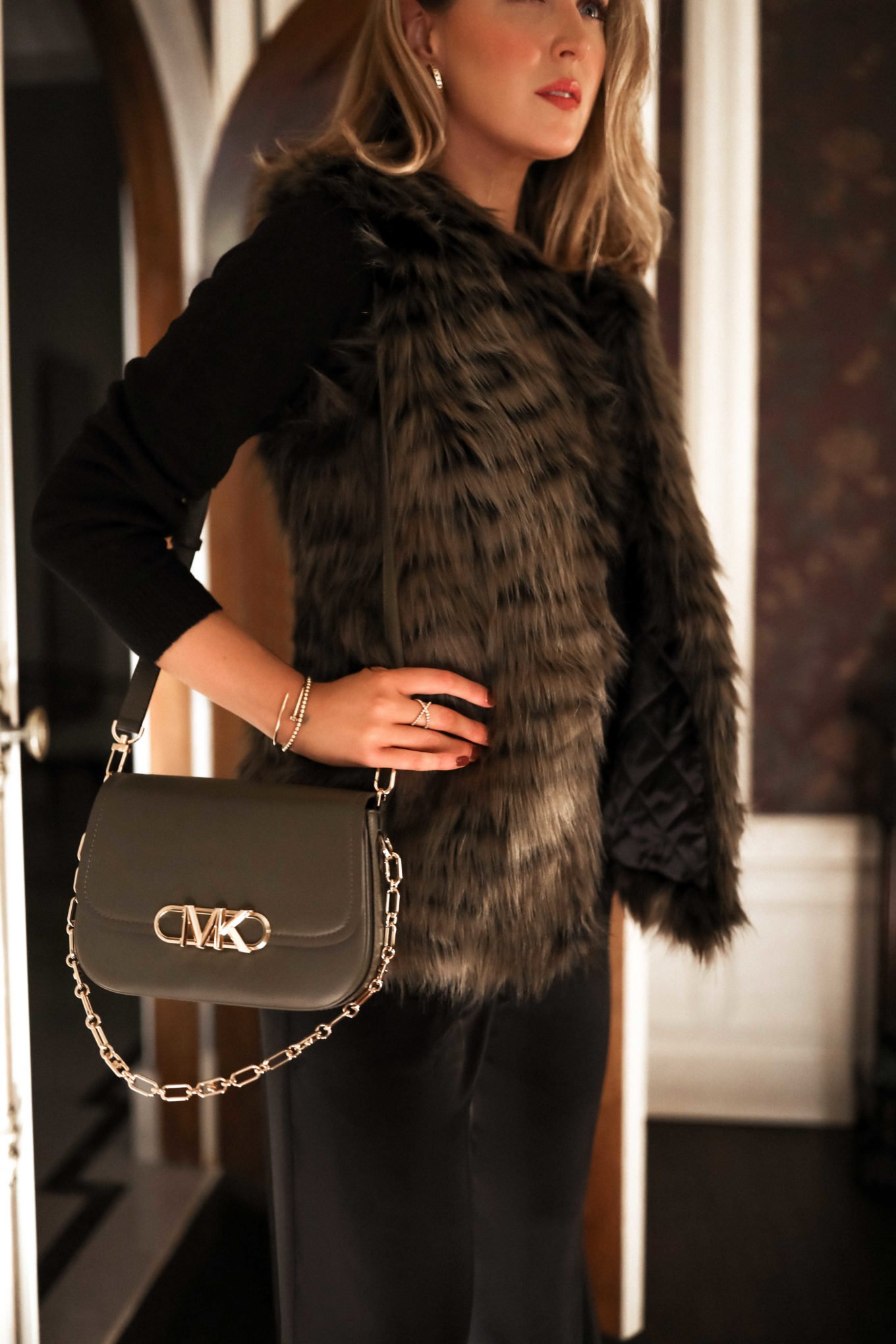 As mentioned, I thought I’d add a little extra “party” to this party pants look by layering this olive Tiger Print Faux Fur Vest over the sweater to match my olive Parker Leather Messenger Bag because my need for a matching moment at all times is pathological at this point. This crossbody with chic chain detailing is part of Michael Kors’ new Parker Collection and is the Goldilocks of purses — not too big, not too small, juuuust right. And they made it in five neutral tones, so… good luck choosing a favorite.