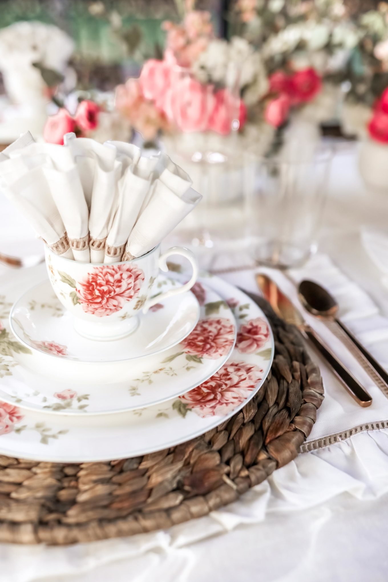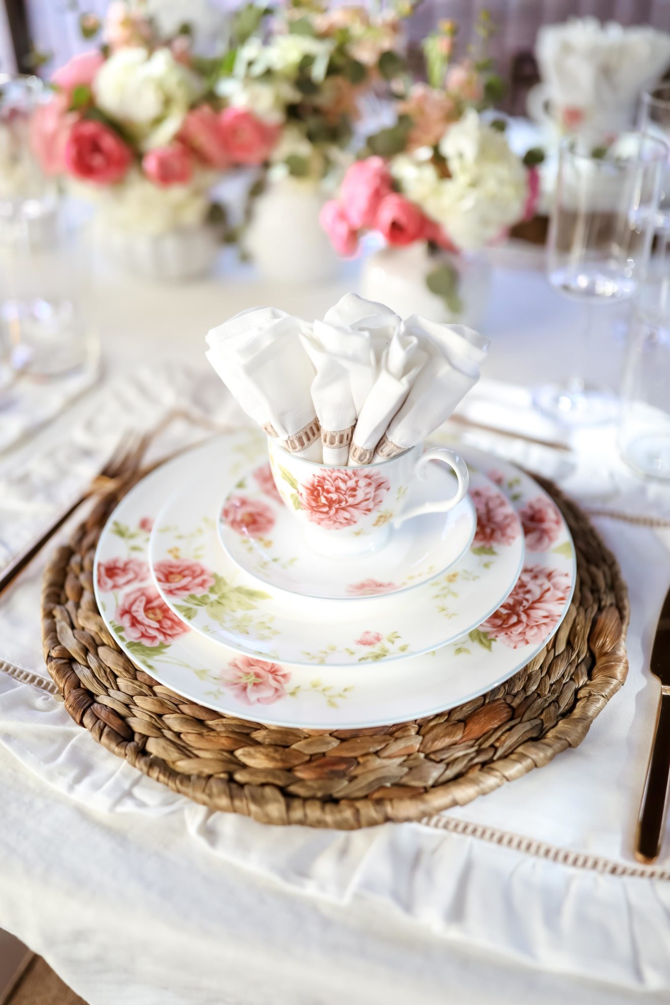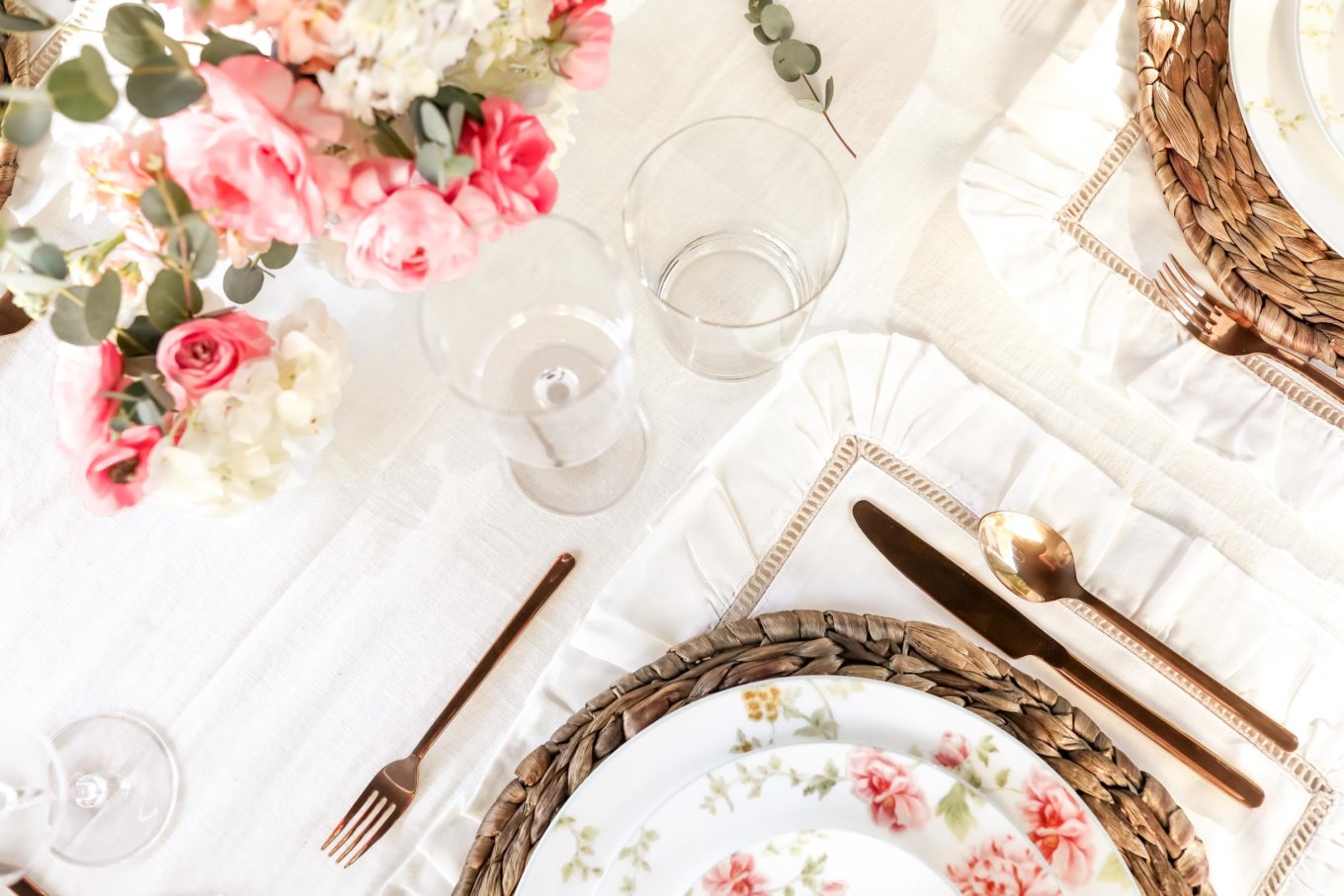 I wanted this Mother’s Day table to be a welcoming, sweetly-styled table with feminine touches and a delicate color palette. For a crisp, classic base layer I used this white linen tablecloth which set a bright stage for the rest of the table setting. It’s also a great staple to have on hand and have at-the-ready for any last-minute entertaining. To add some dimension and a little bit of seasonal texture, I added this set of natural fiber woven placemats on top of sweetly ruffled hemstitch placemats which demanded they be paired with the matching ruffle hemstich napkins, obviously. This Noritake china features the most charming peony pattern, ideal for Mother’s Day and eminently reusable for a variety of gatherings including afternoon teas, weekend brunches, you name it. I mean, just look at the detail on these plates! What’s that you ask? Is there a delicate blue rim on each pieces? Of course there is. Also, if you’ve been searching high and low for the perfect set of dishwasher-safe brushed copper flatware, you’re welcome my friends. Very welcome indeed.