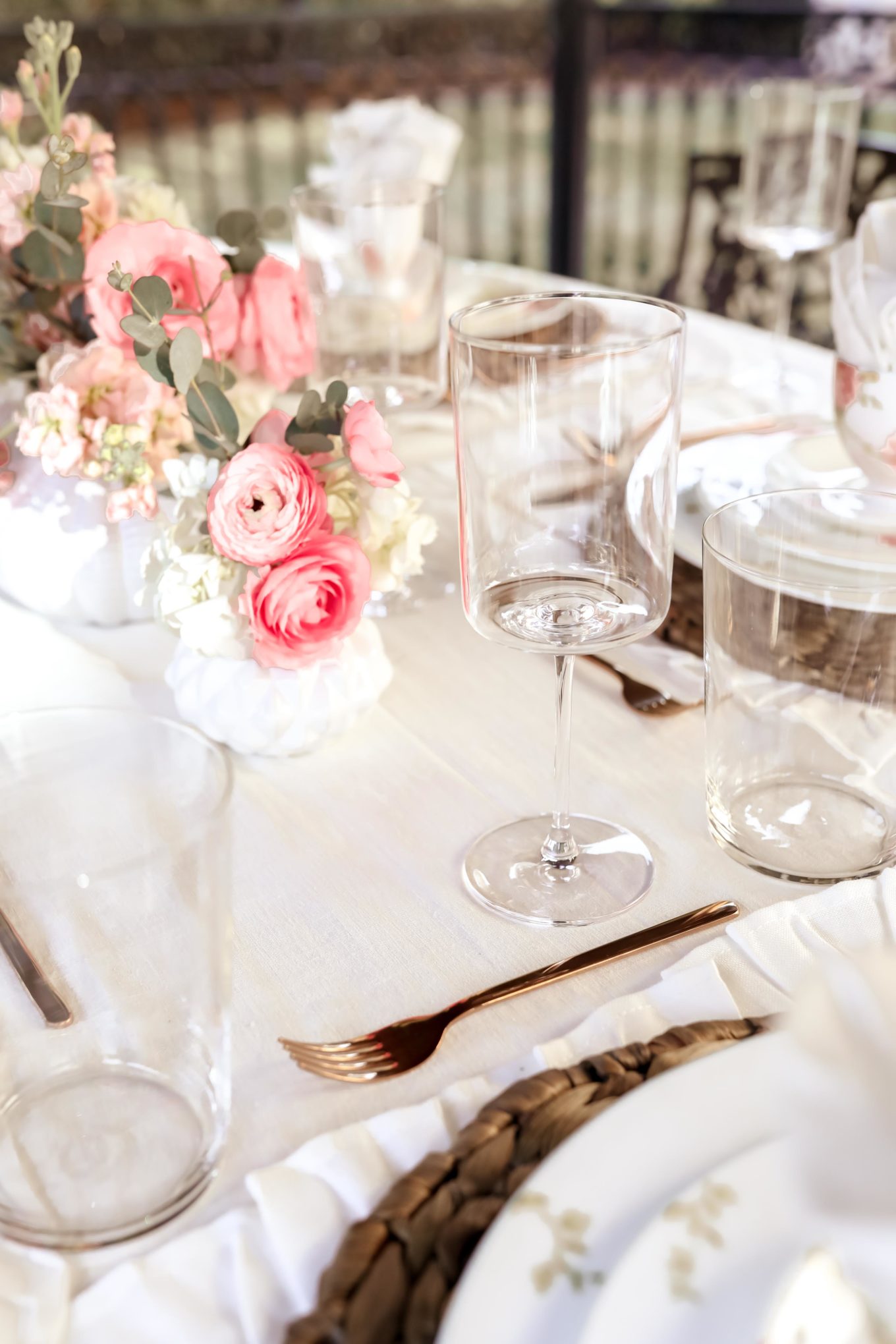 Let’s talk drinking vessels, because the right table setting with the wrong glassware loses its luster, quickly. When your table is bursting with floral china, woven placemats and ruffles galore, sometimes you need to go simple with the glassware so as not to over-style your table. Thankfully, this set of sleek, modern stemware was waiting for me at Home Depot, ready to join the party.