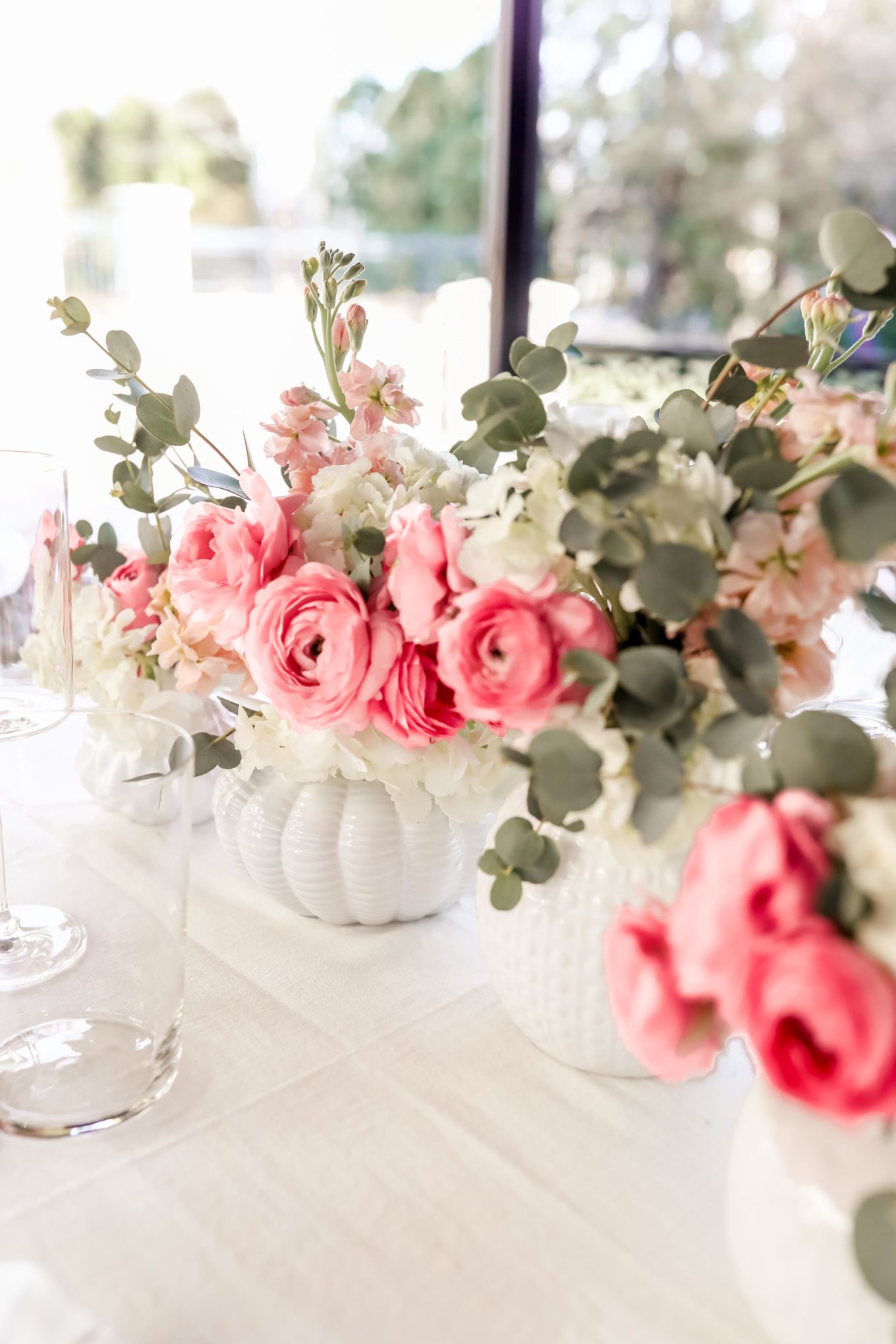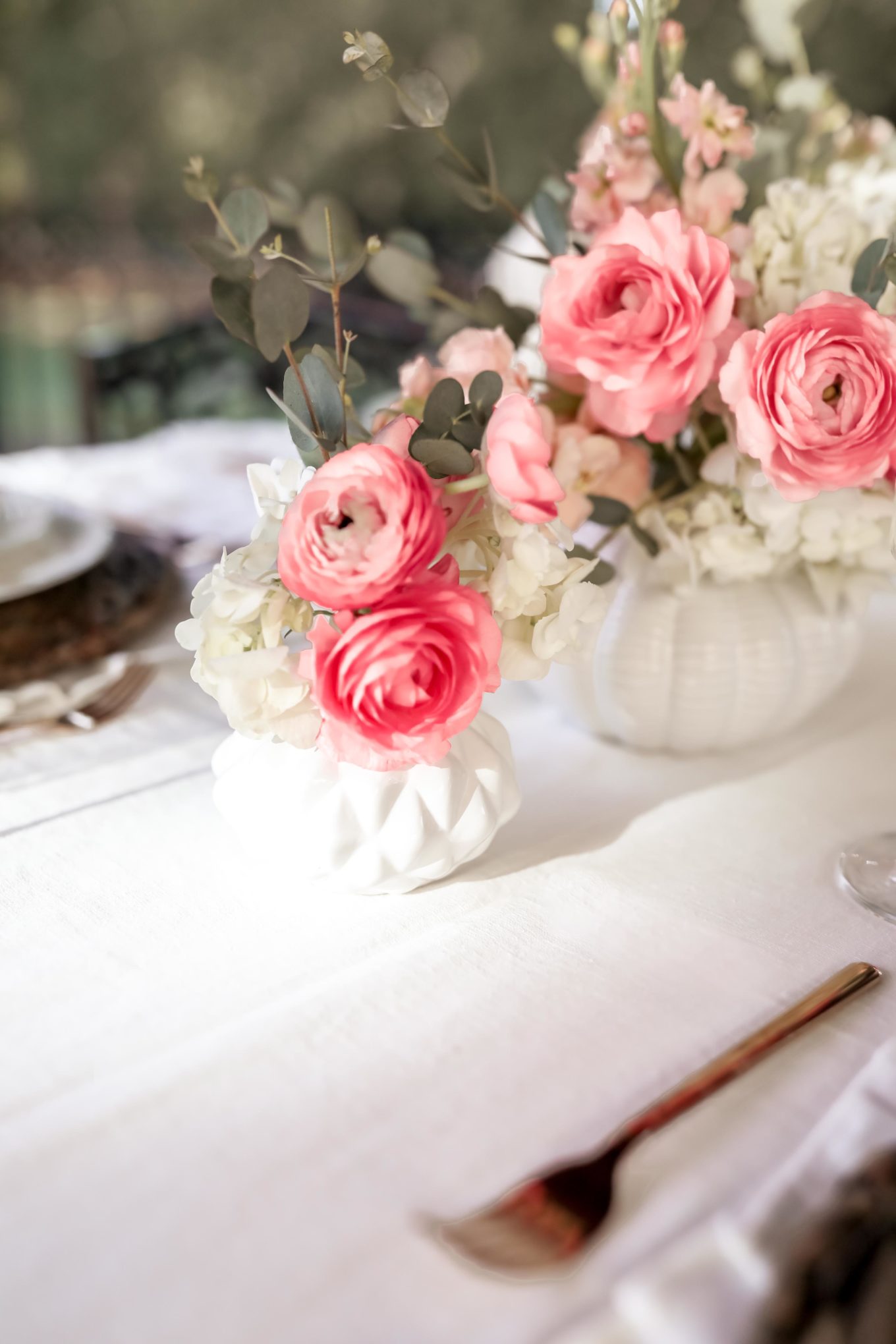 Now, let’s talk centerpieces, because I know we’ve all been looking forward to this part. One of my absolute favorite finds was this classic ceramic set of bud vases. I used three of the bigger vases on our Easter table a couple weeks ago and am using four smaller vases from the set here. I’m telling you, a set of bud vases like this is ideal. You will use it countless times in a million different combinations and the assorted heights not only add visual interest but also ensure that there’s always an ideal mix of vases for any table you put together.