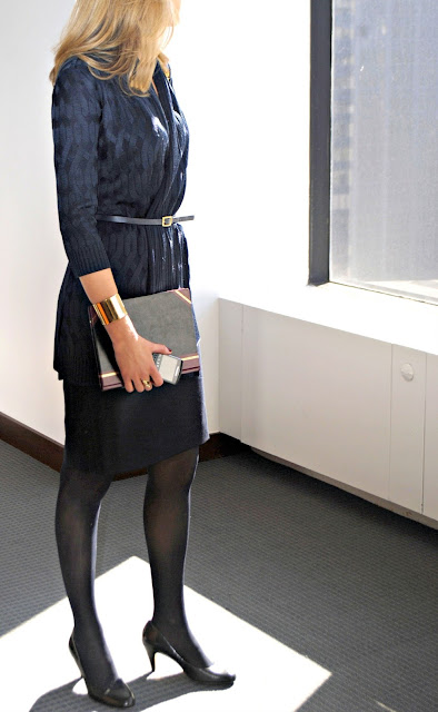There’s definitely nothing depressing about these blues… Sweater: St. John; Skirt: J. Crew; Cuff Bracelet: J. Crew; Earrings: old; Necklace: vintage; Belt: vintage; Tights: Hue; Heels: Ted Baker; Polish: Essie (Berry Naughty)