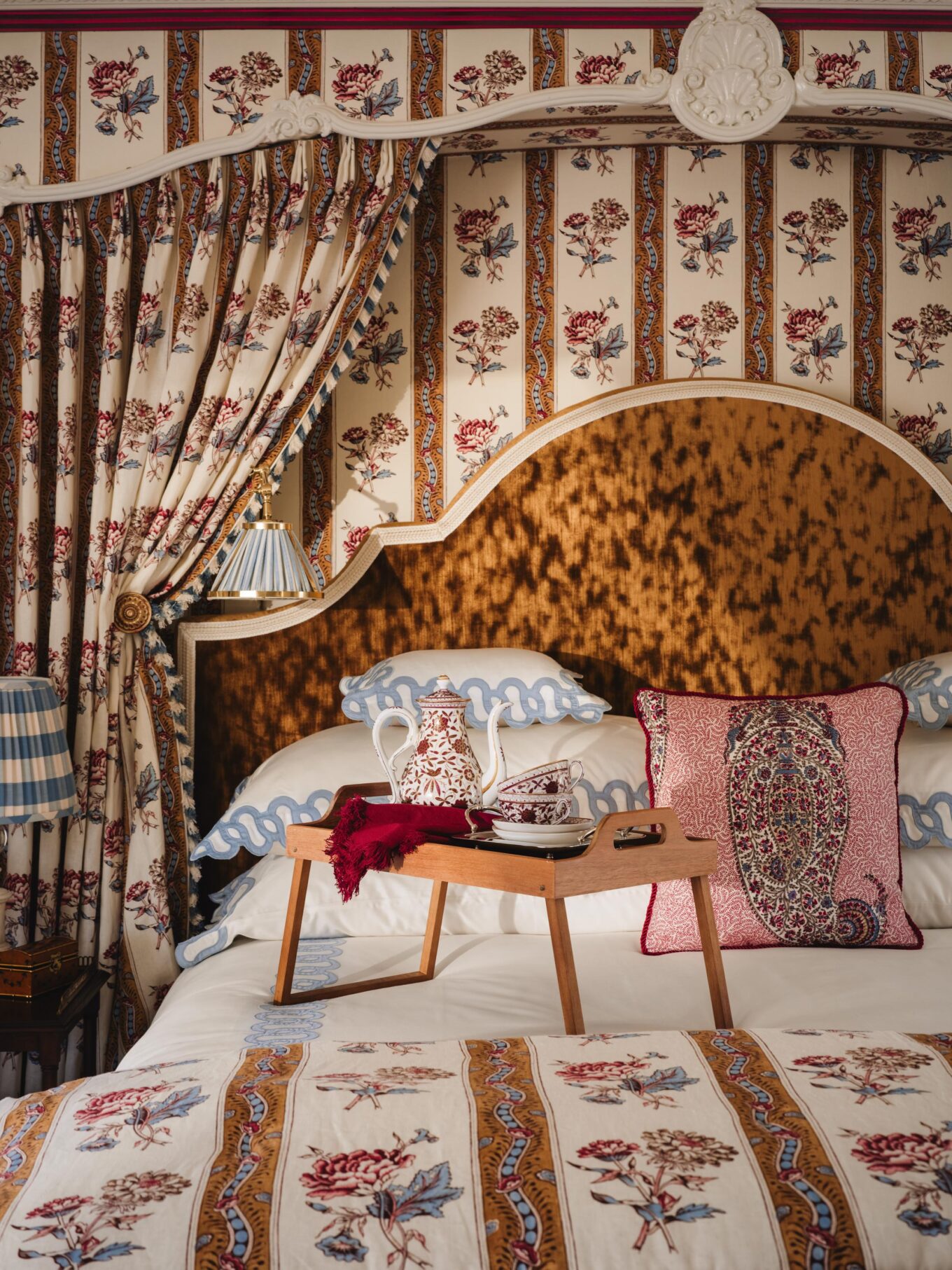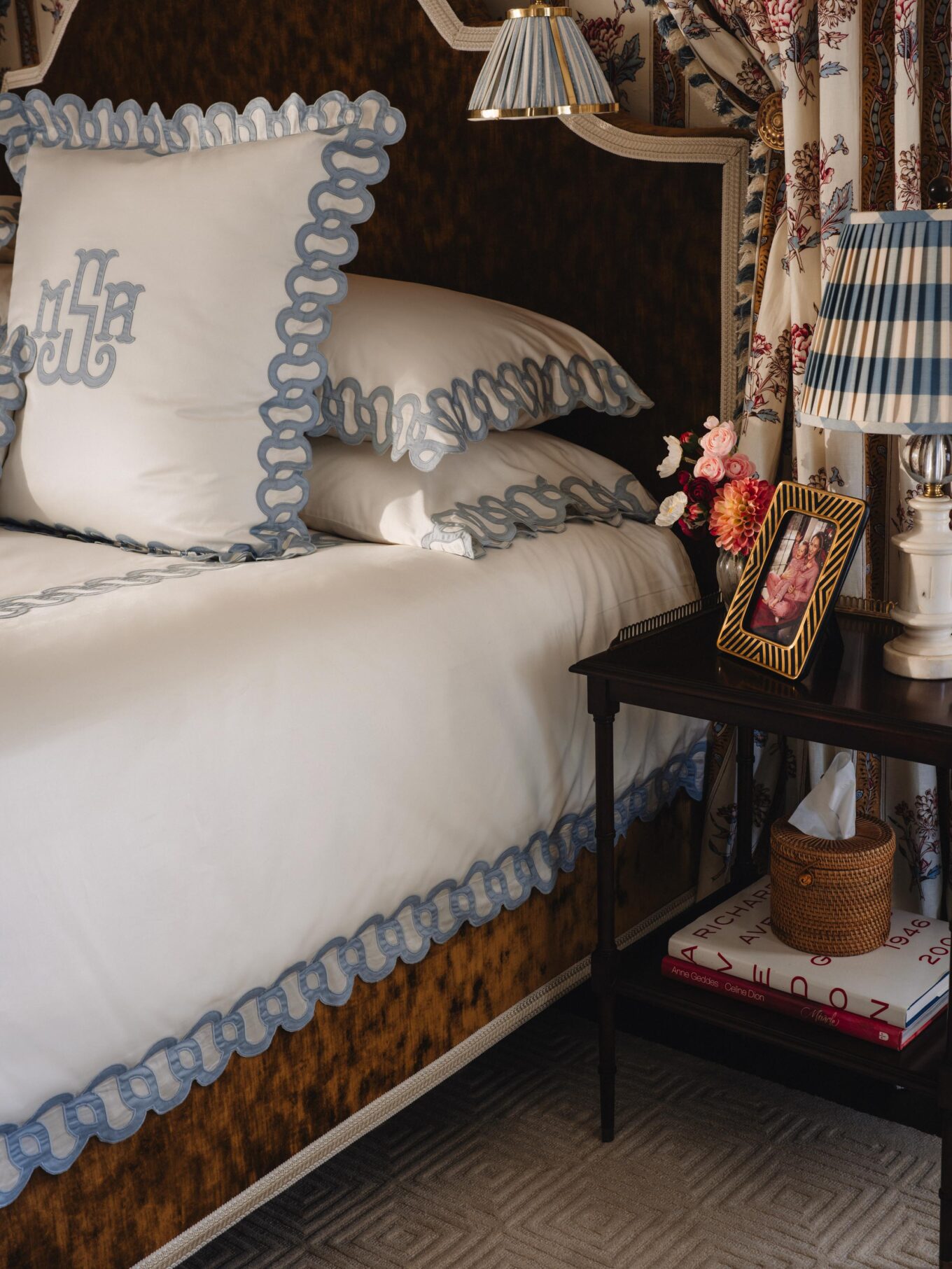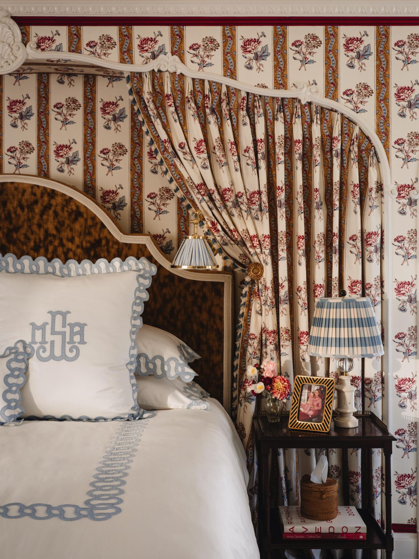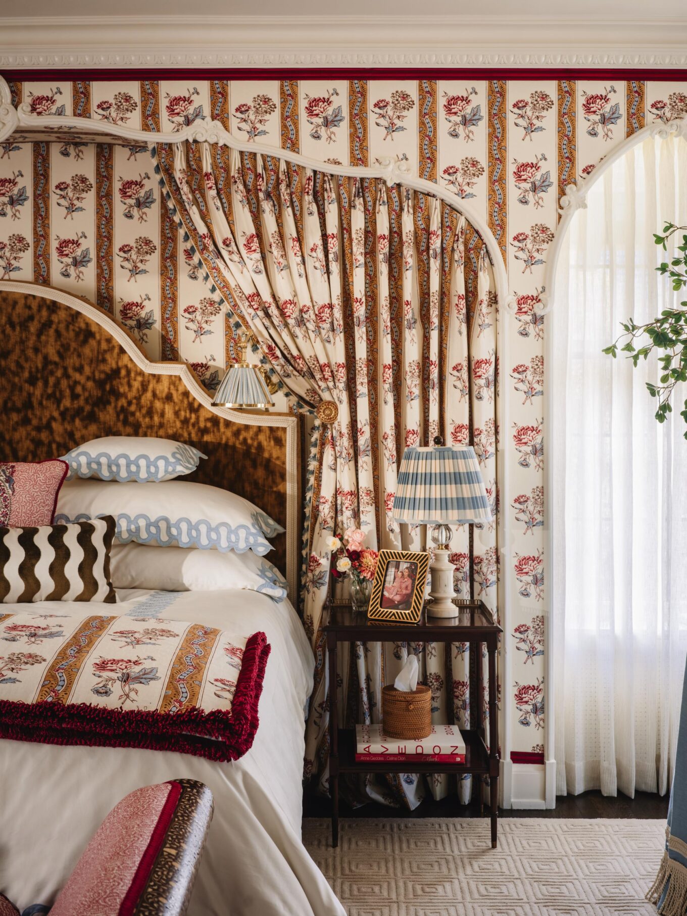 BED: Custom, covered in Kravet Couture High Impact Amber velvet and trim is the Bagatelle Braid in Gardenia by Timothy Corrigan for Samuel & Sons
