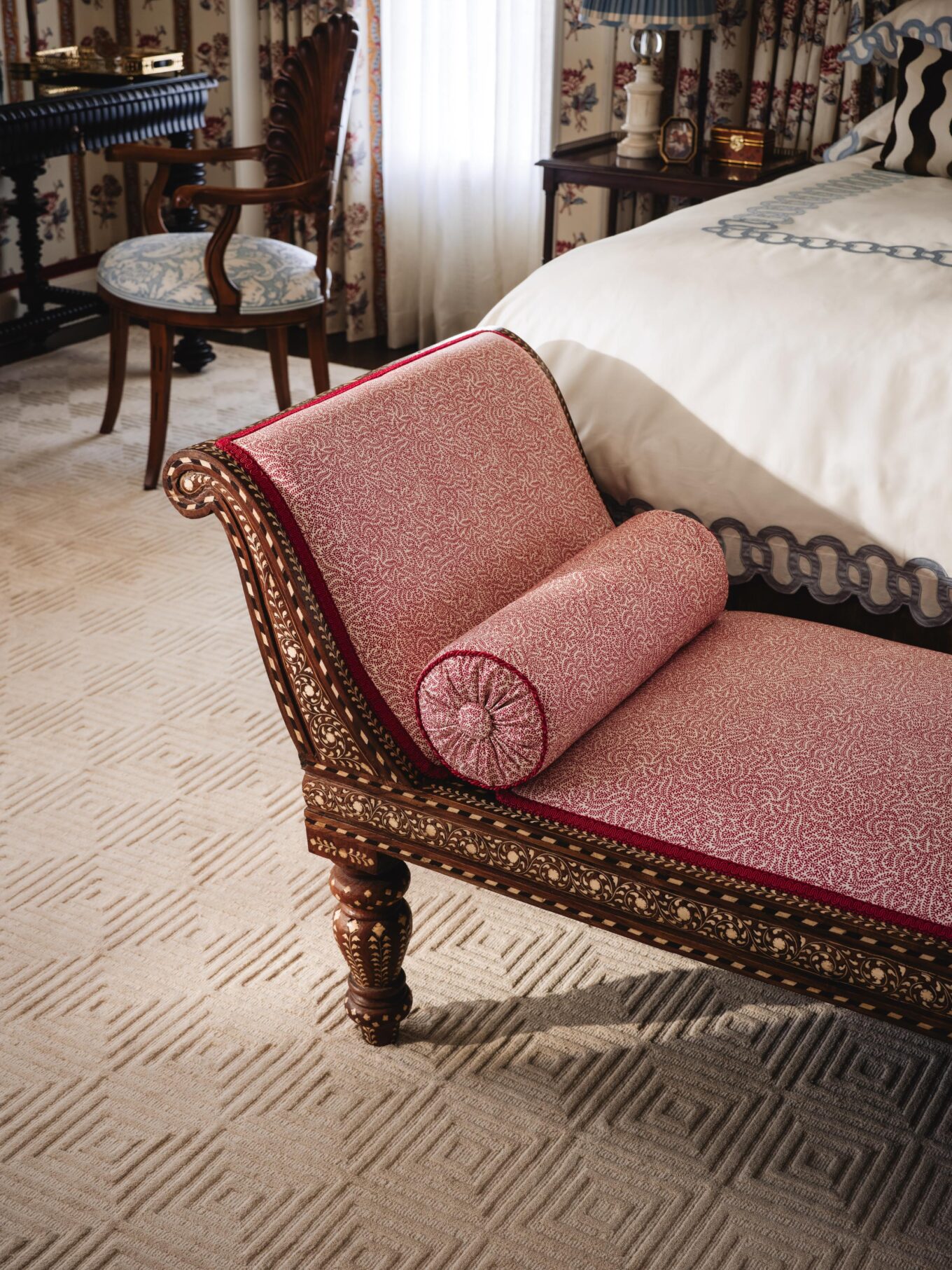 INLAY BENCH: Antique from John Robshaw covered in Soane’s Coral fabric in shade Pink