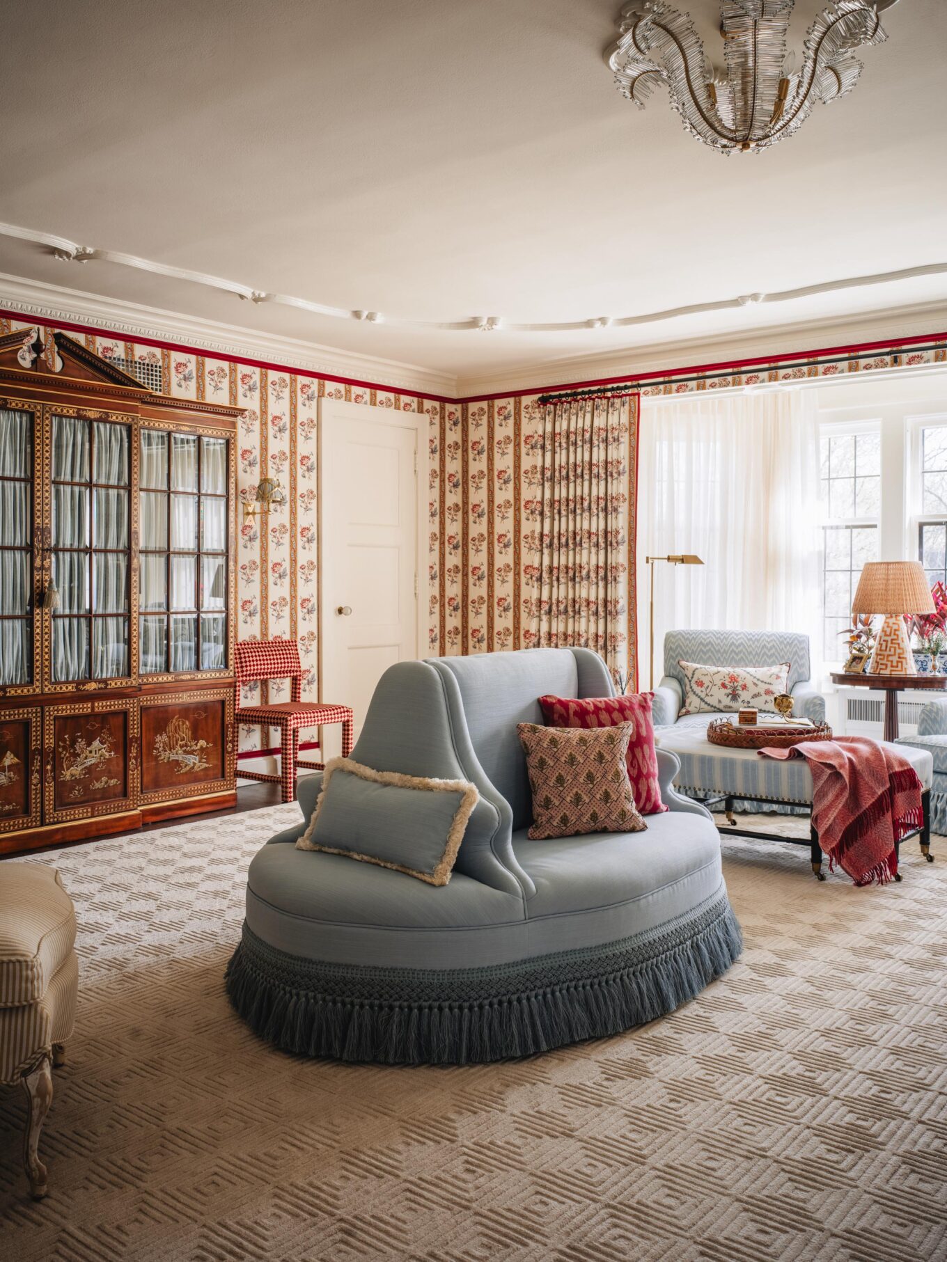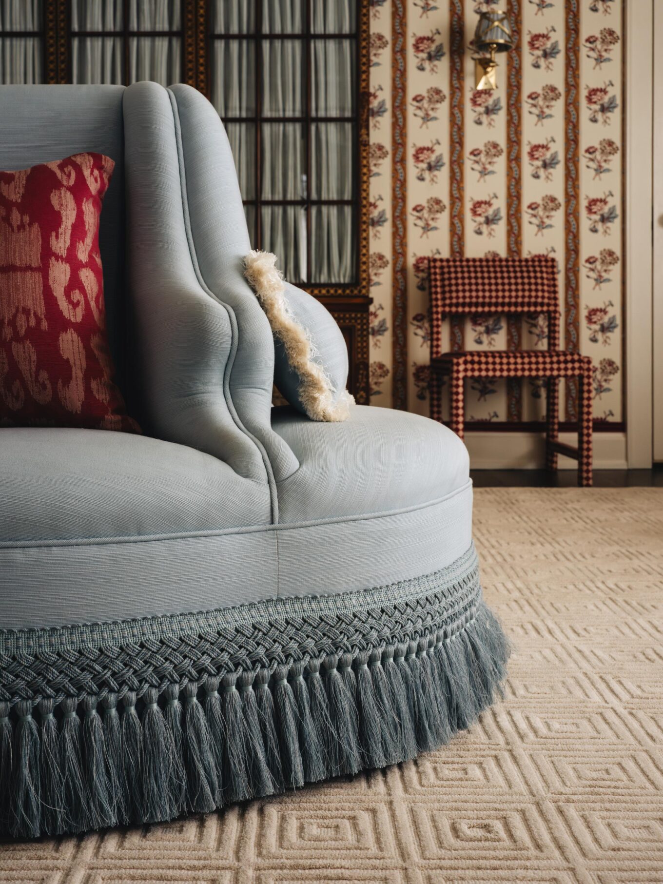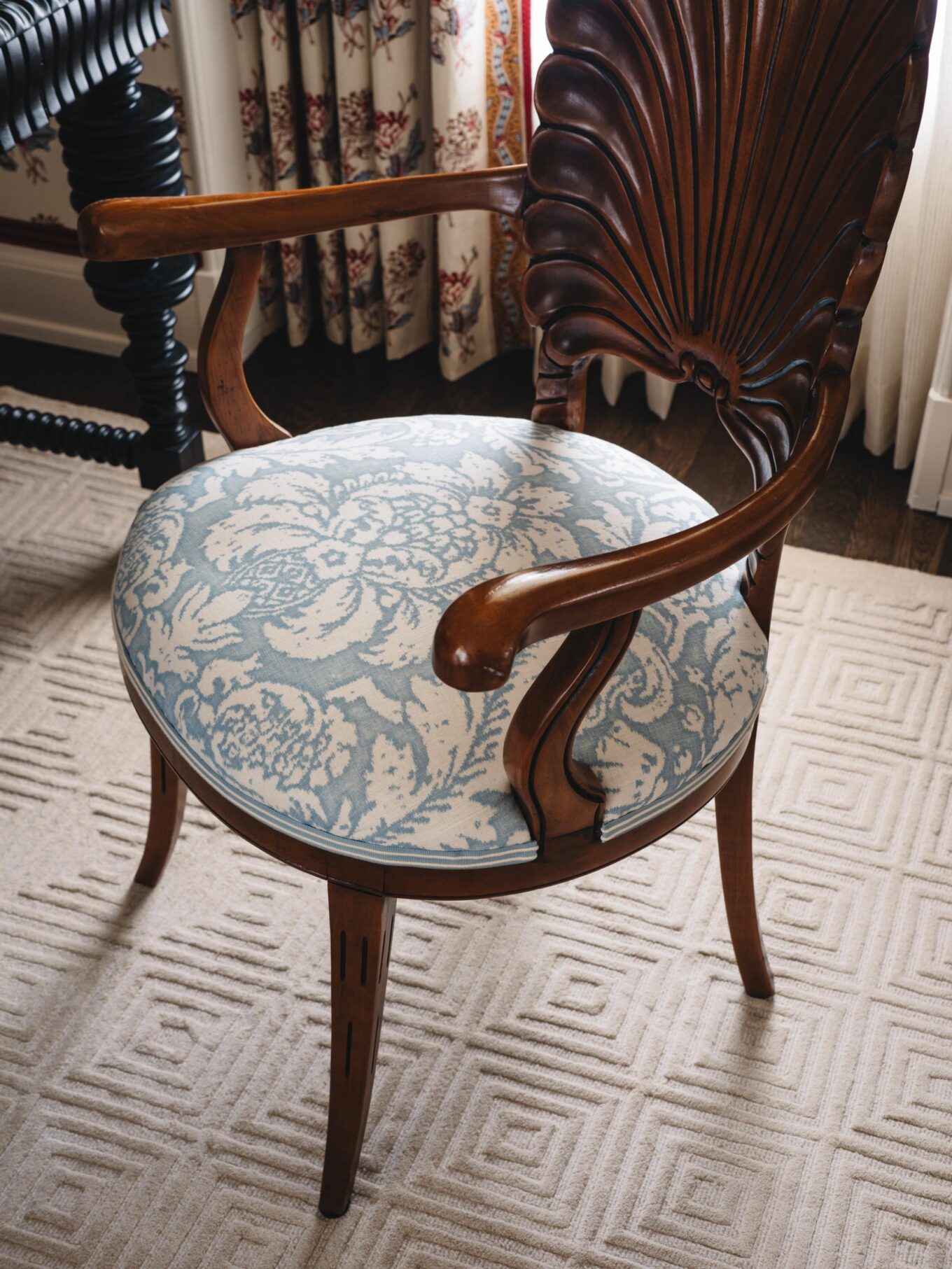 CHAIR: Italian Antique Grotto Chair via Chairish upholstered in Casa Branca Damasco fabric with MDS Rosette Gimp from Mark Sikes’s collection for Samuel and Sons in Sky