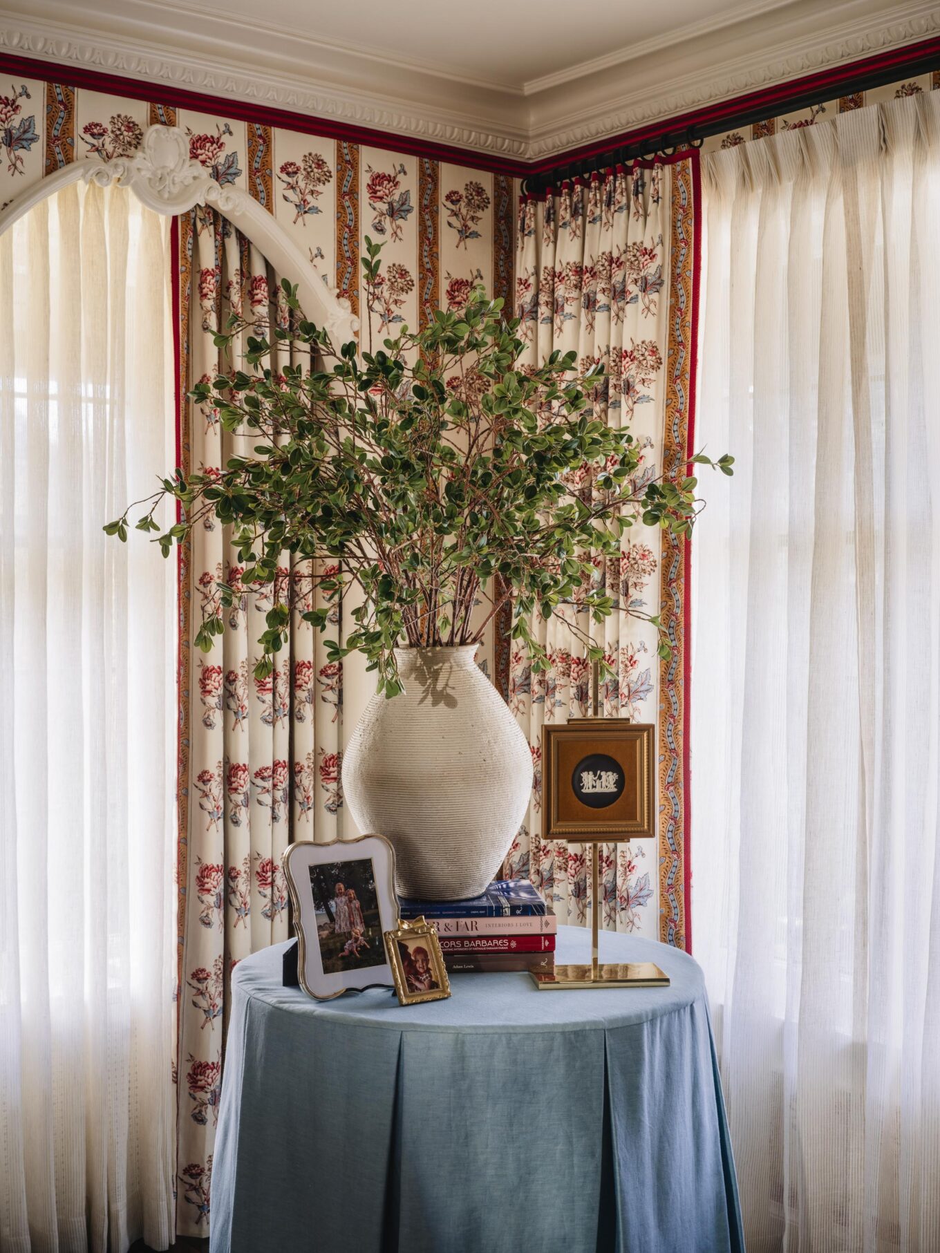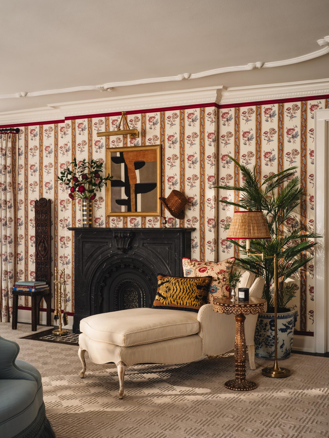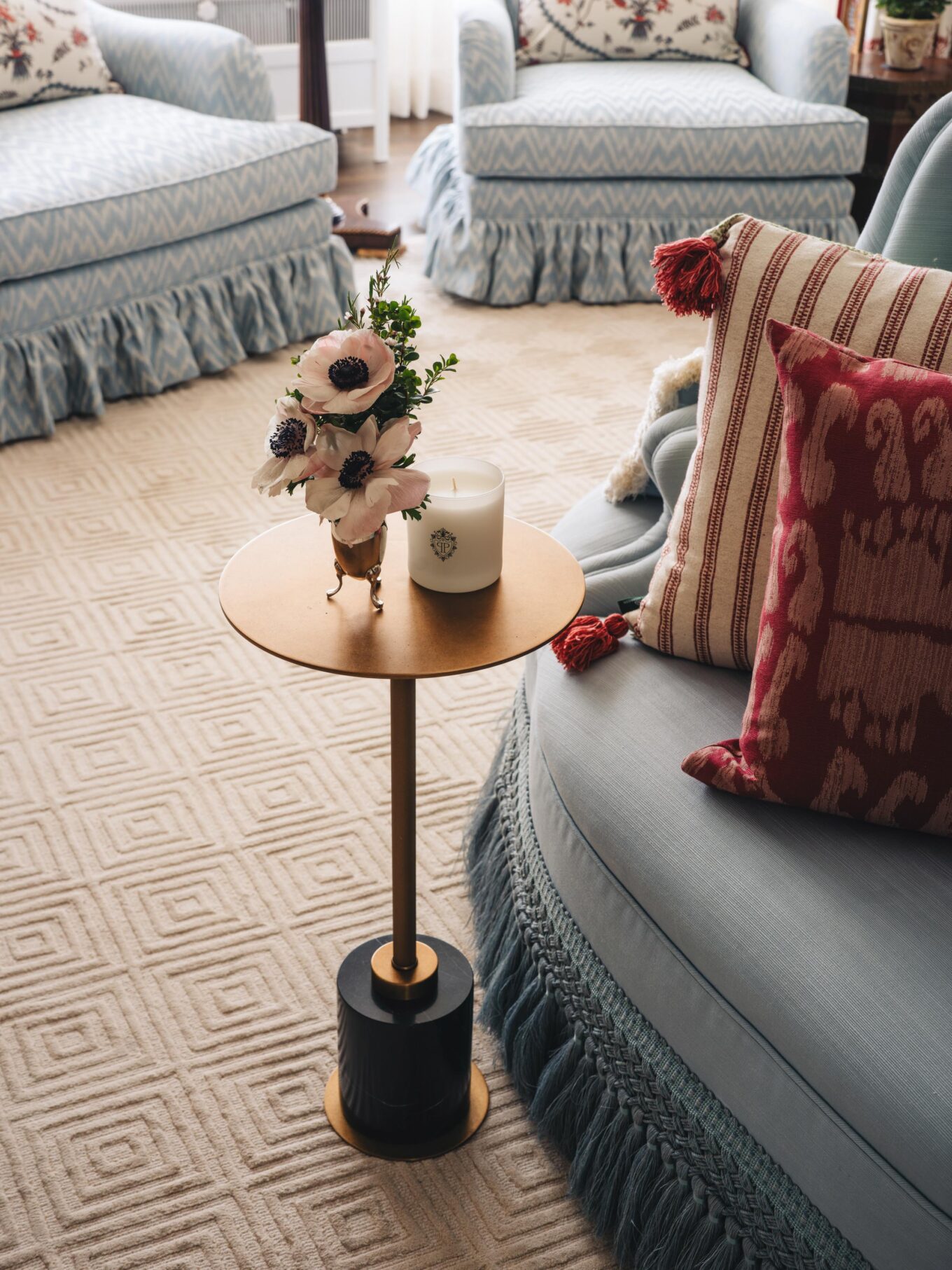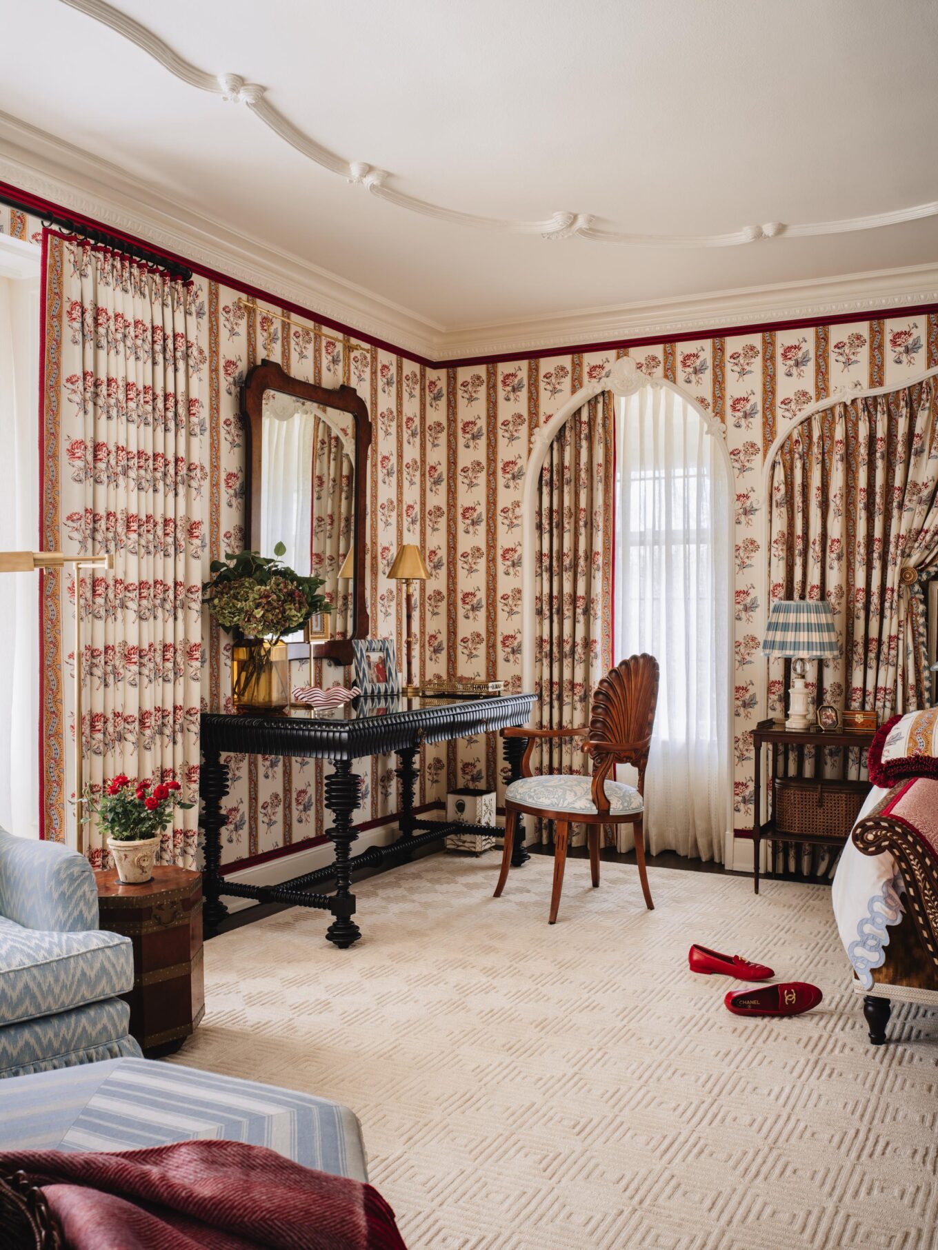 CHAIR: Italian Antique Grotto Chair via Chairish upholstered in Casa Branca Damasco fabric with MDS Rosette Gimp from Mark Sikes’s collection for Samuel and Sons in Sky