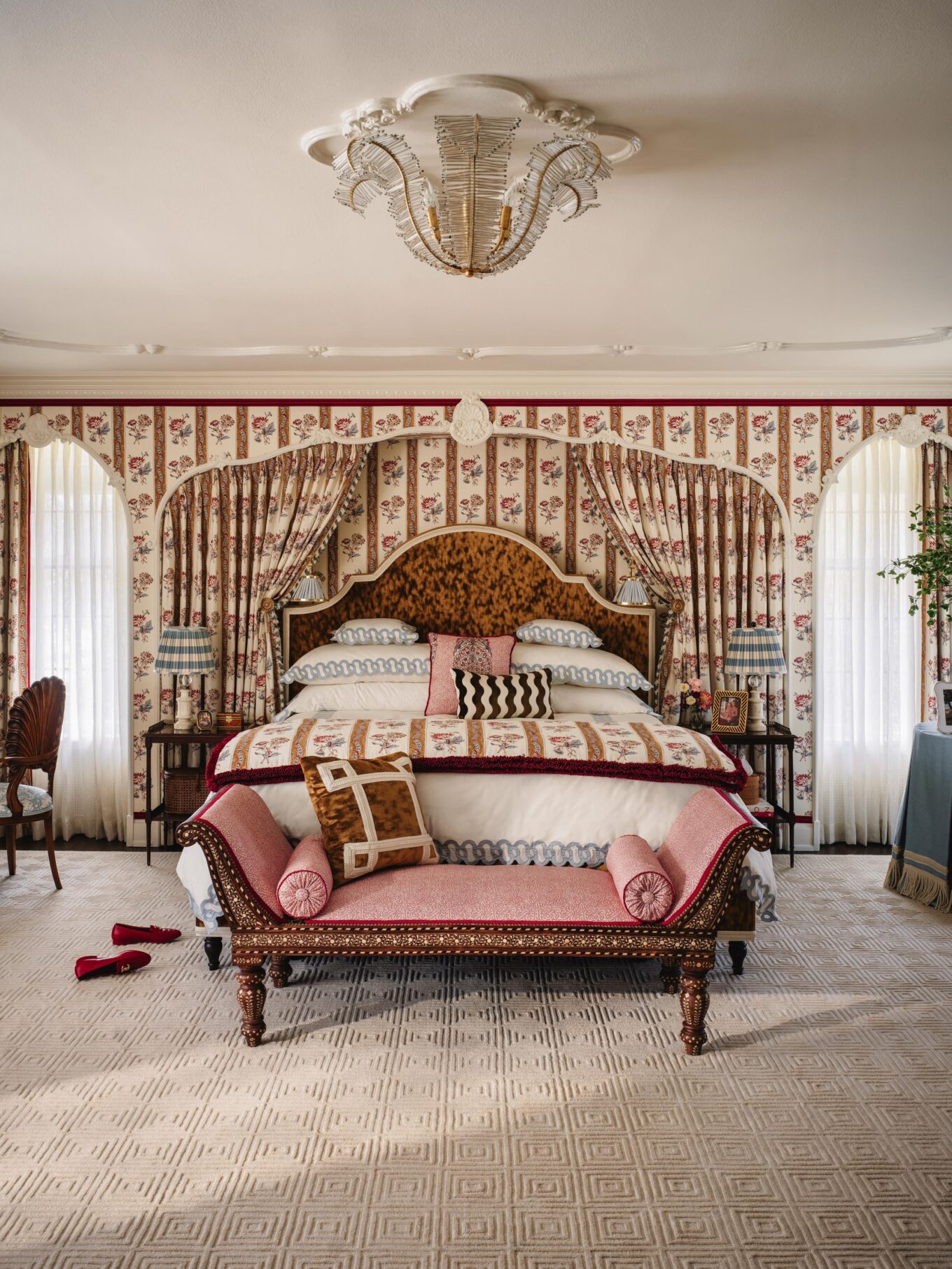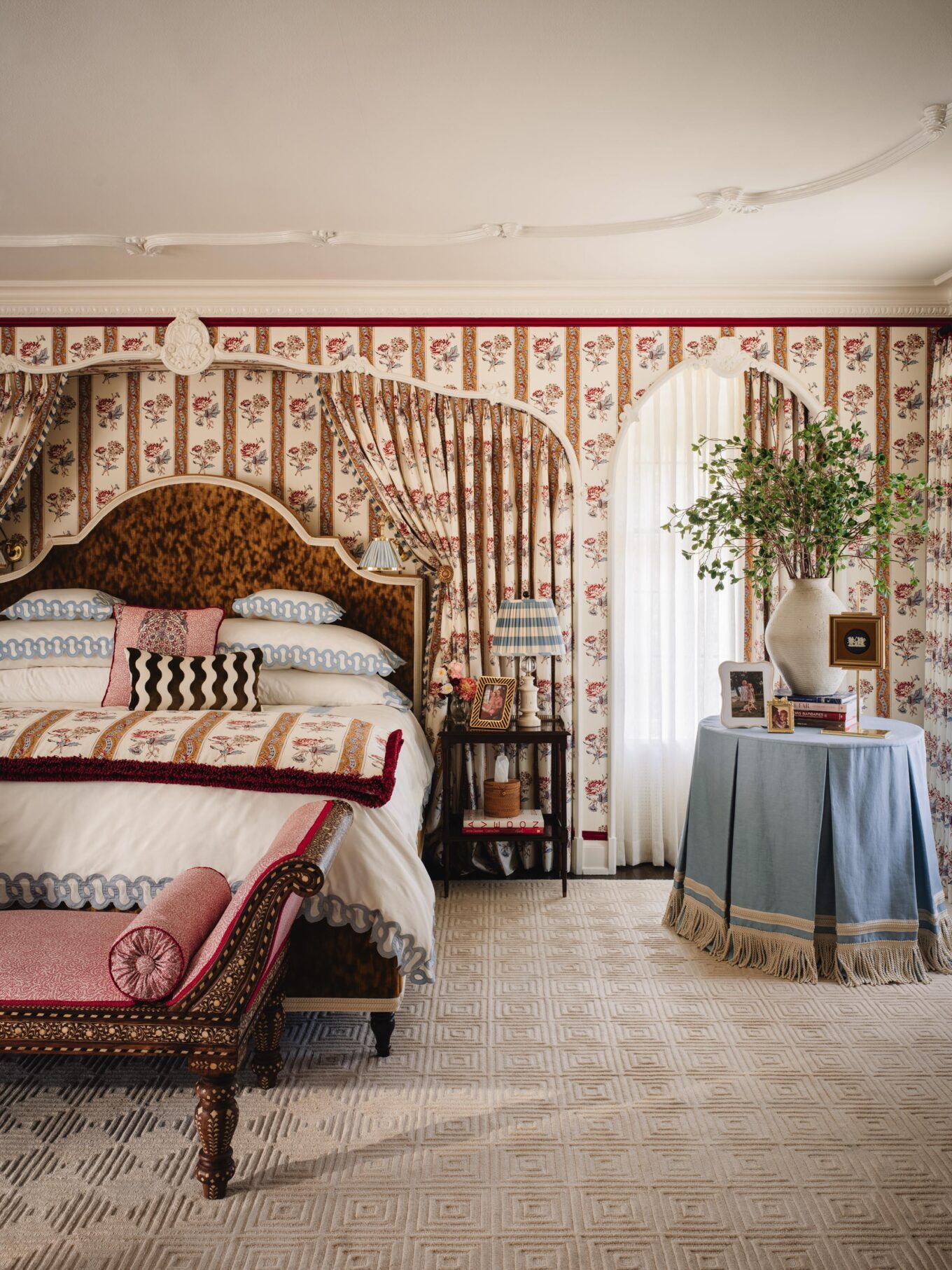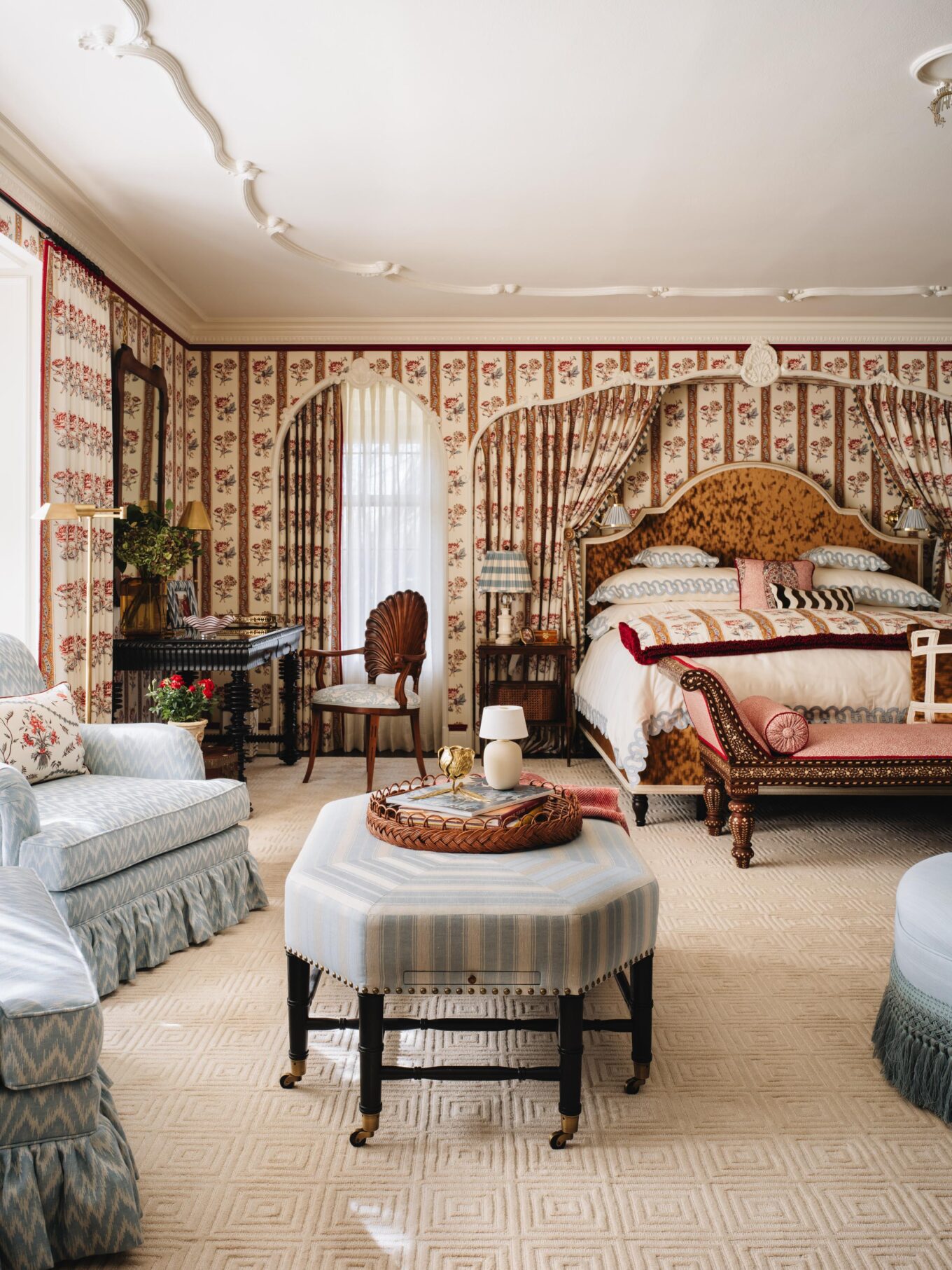 PILLOWS: Custom in Penny Morrison Ticking Stripe Rose, Schumacher Nallamala in Garnet, and Schumacher’s Blair Silk Épinglé in Wythe Rose