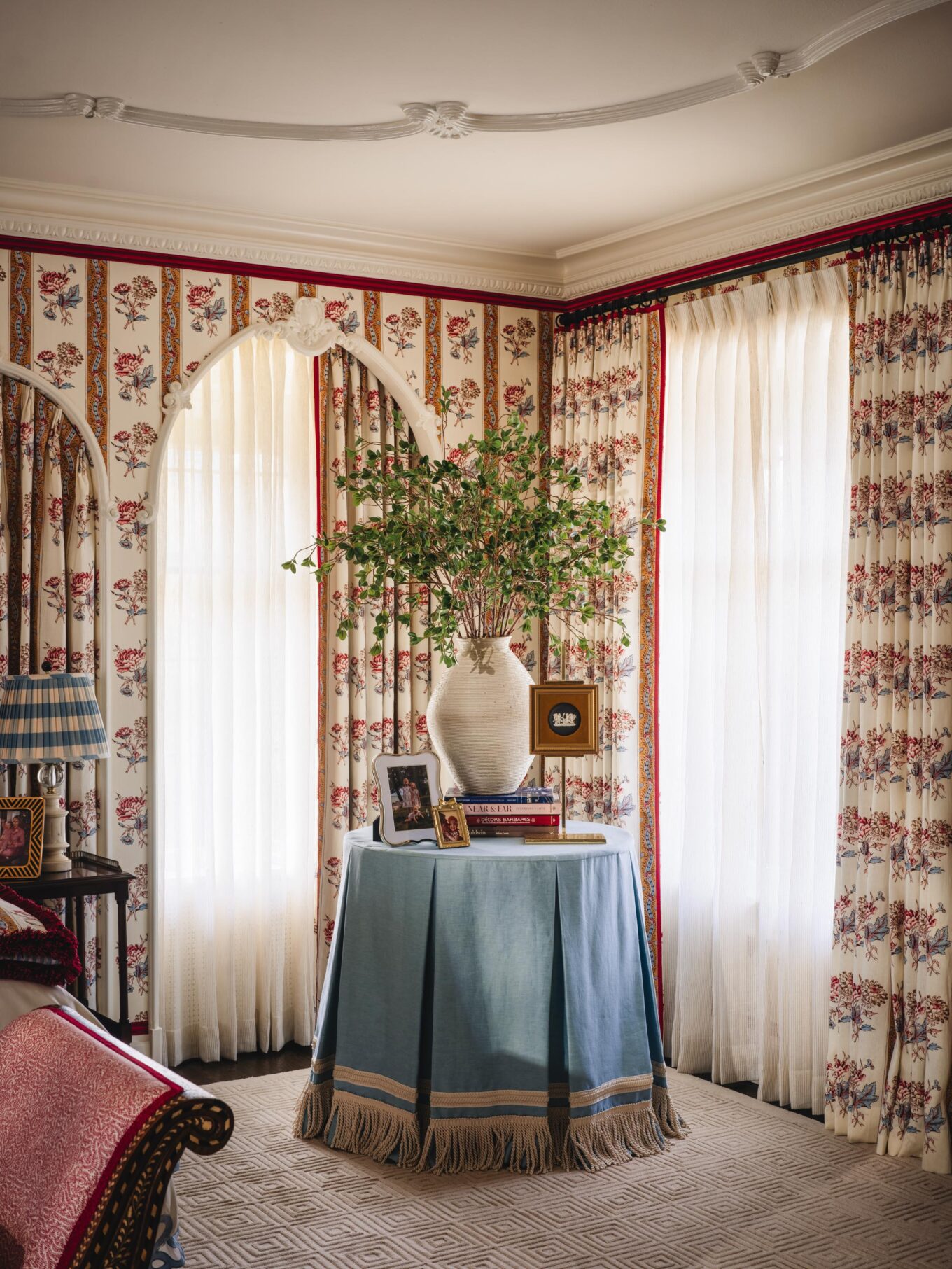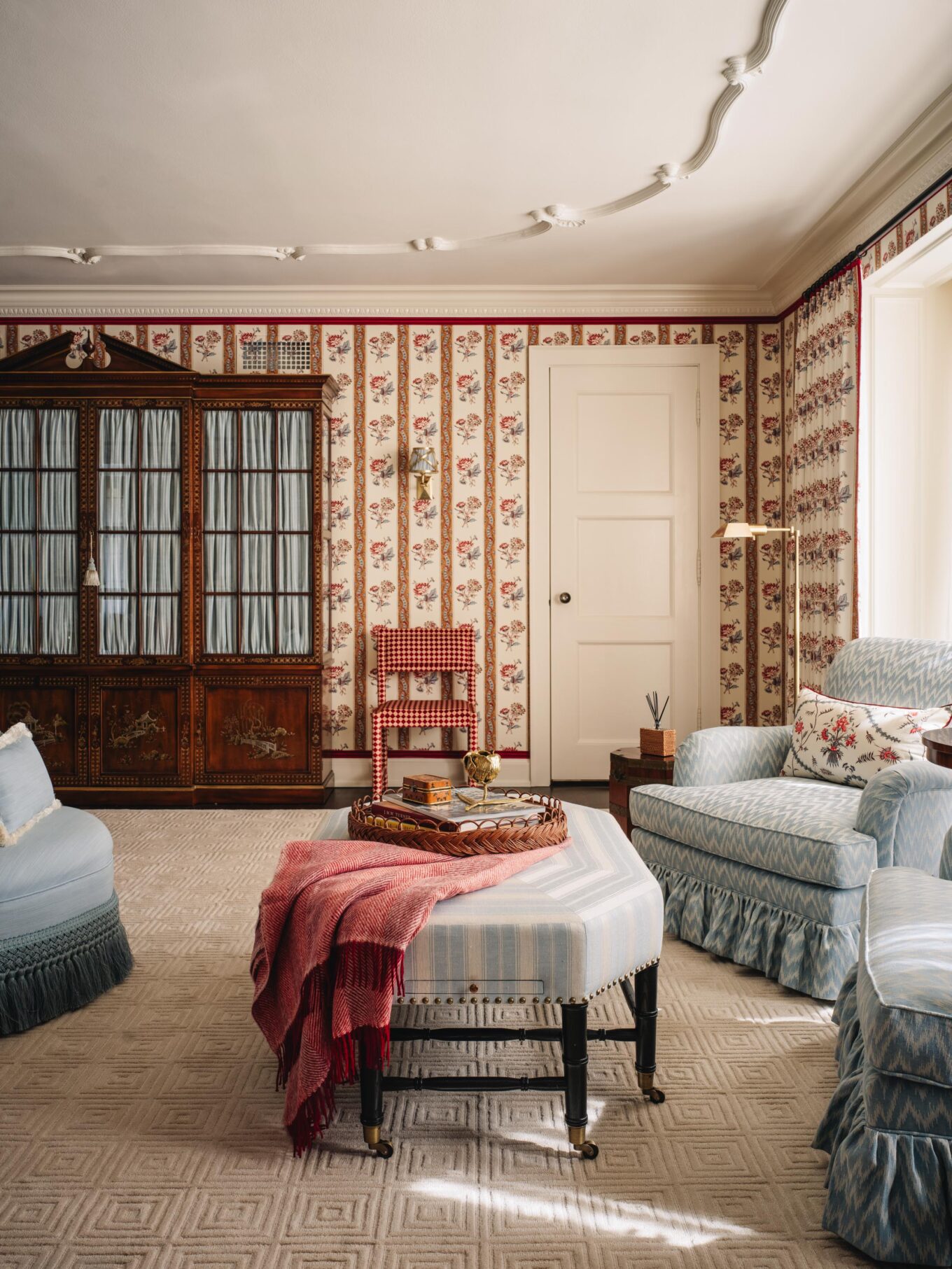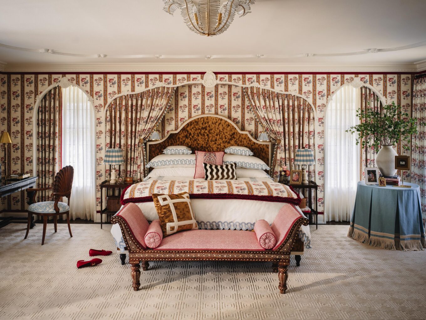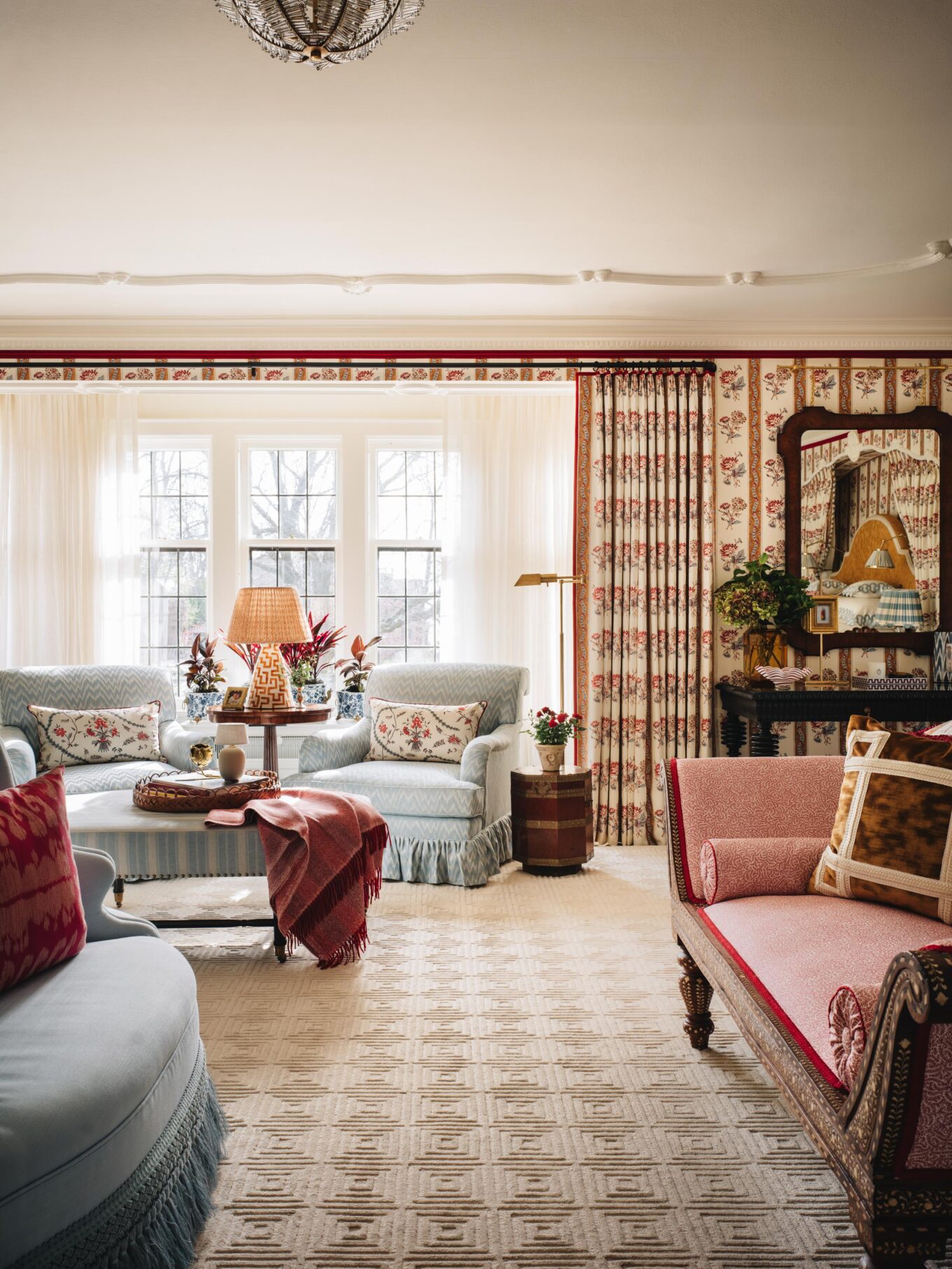 PILLOWS: Custom in Penny Morrison Ticking Stripe Rose, Schumacher Nallamala in Garnet, and Schumacher’s Blair Silk Épinglé in Wythe Rose