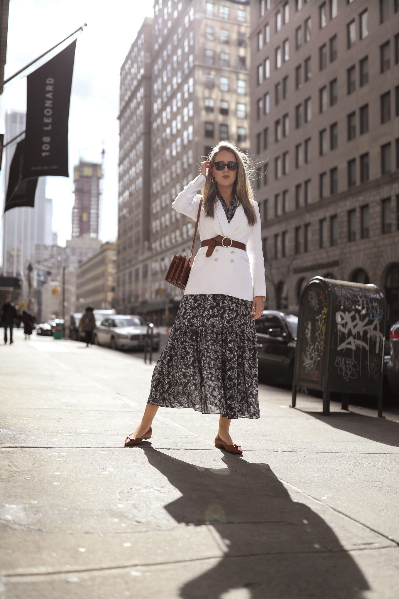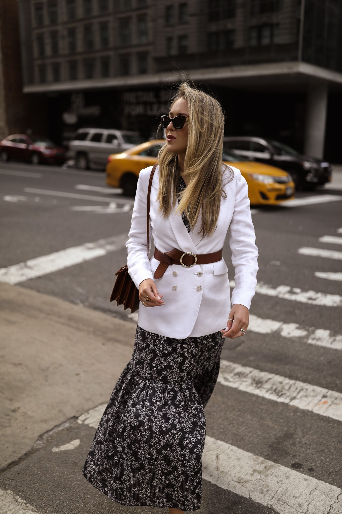 One example of a spring style move to toss into heavy rotation is in this look. Which, if we dig deep here, is an outfit full of favorites. First, a belted look. Hi, my name is Mary, and I have a propensity to belt everything. Have we met? Second, a fun spring floral that defies all frilly conventions (this one’s from Banana Republic). Third, Sarah Flint Natalie flats in Cognac Brown. Which are actually a favorite of none other than Meghan Markle’s. And finally, a beautiful white blazer for spring. Which I hope you enjoy because you’re about to see it a lot.