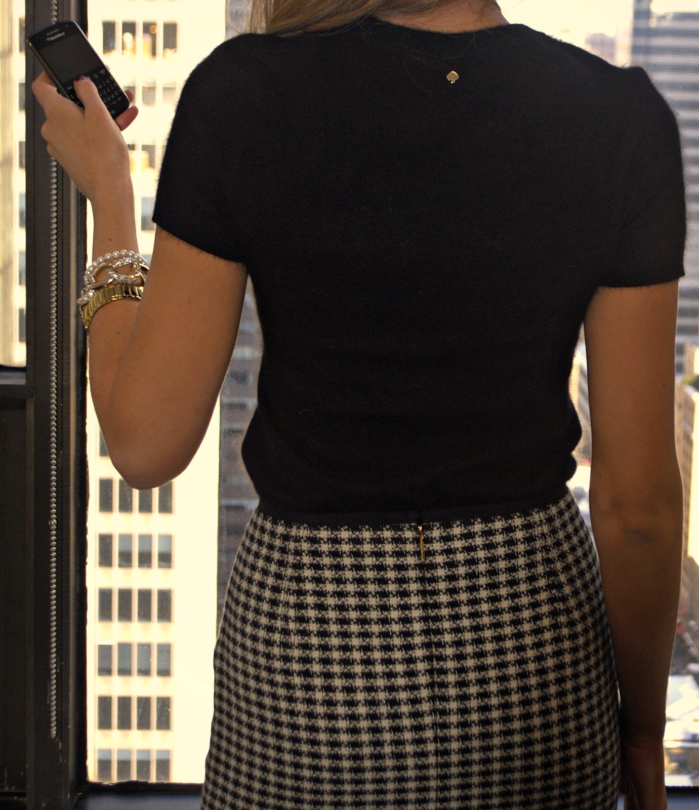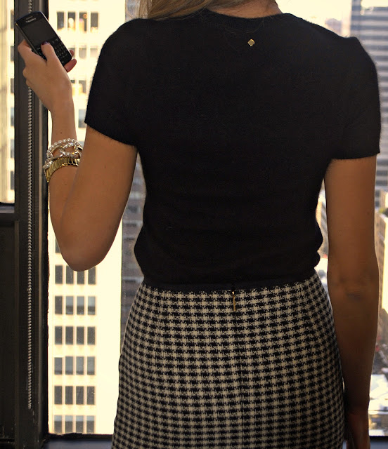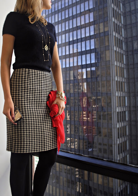 Skirt: Tory Burch; Sweater: Kate Spade; Watch: Skagen (similar here); Bracelet: Style Queen (similar here); Pearl Bracelet: old; Ring: KT Collection NYC; Gold Necklaces: Gorjana; Gold/Pearl Necklace: old; Shoes: J. Crew; Polish: Essie (Berry Naughty); Tights: Wolford; Scarf: Diwali Paris