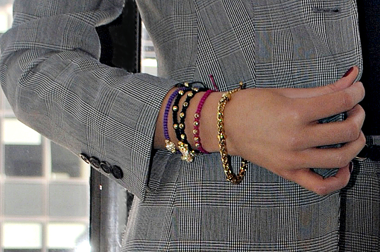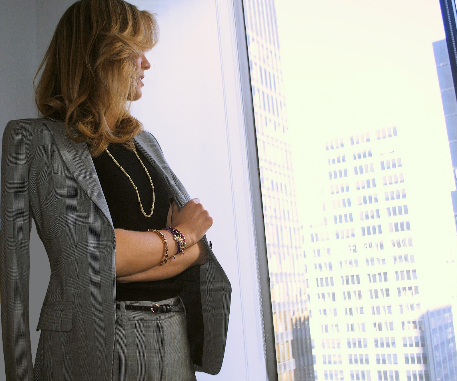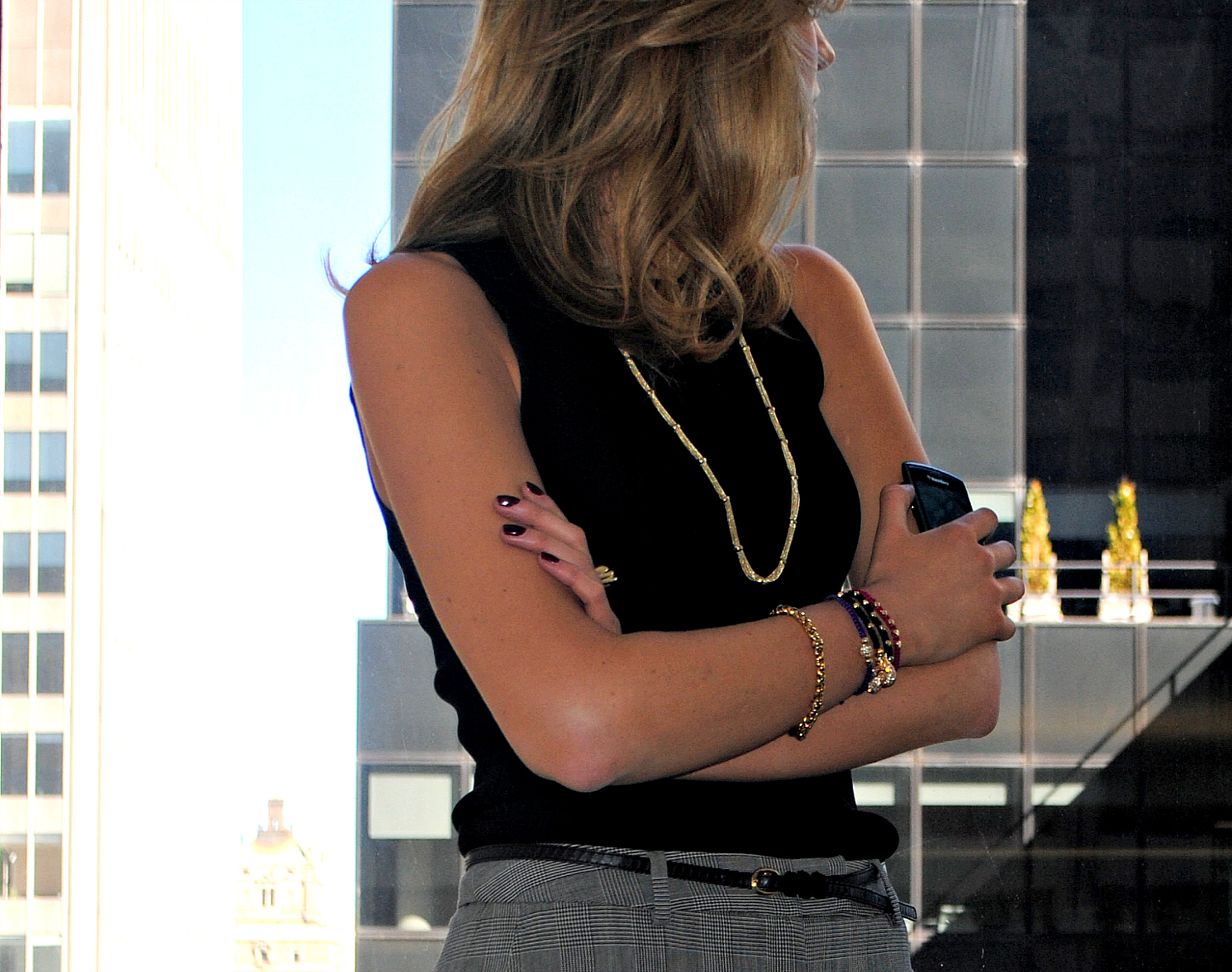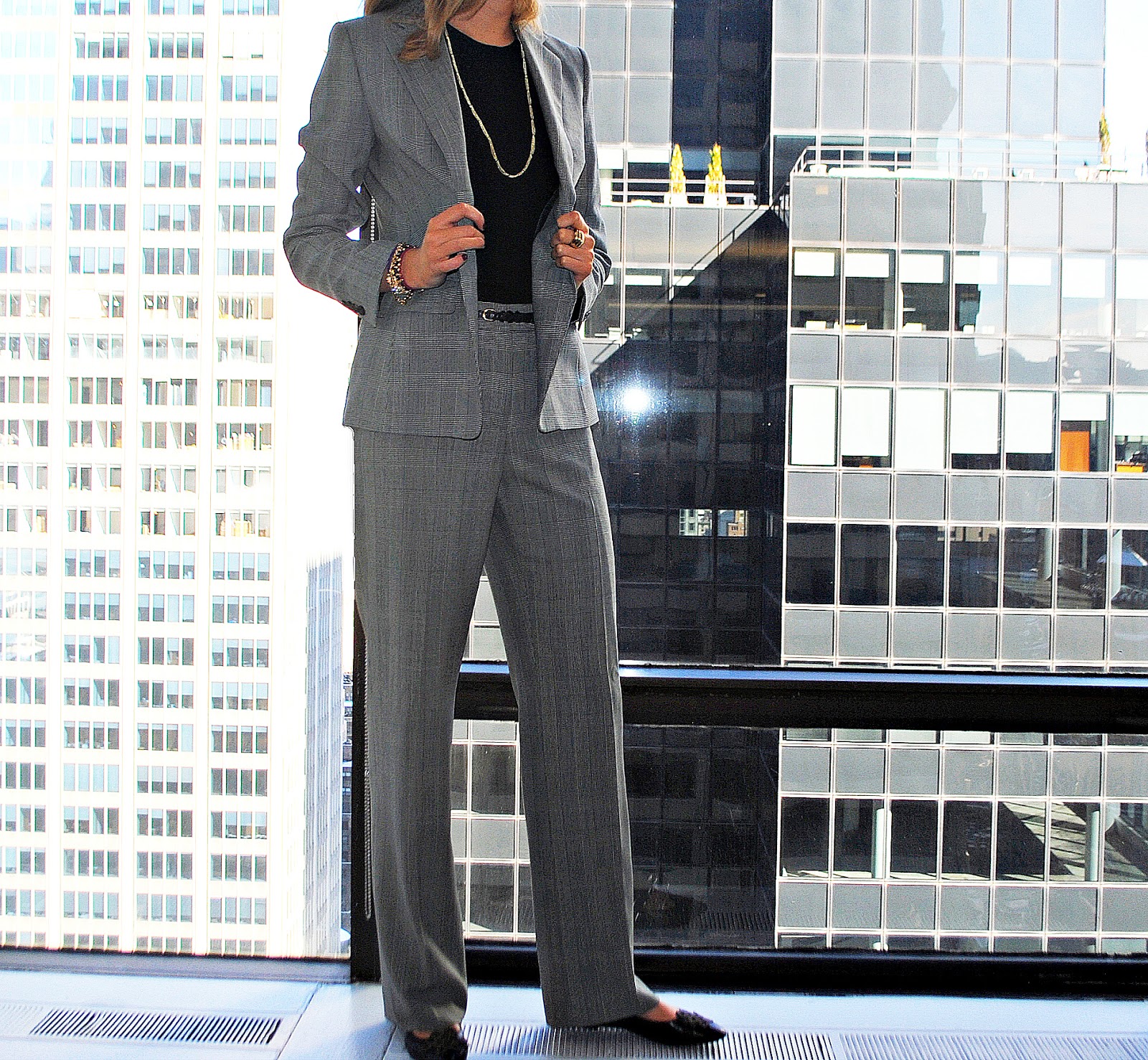 Suit: Brooks Brothers; Shell: Ann Taylor; Shoes: Diane Von Furstenberg Magnolia Flats; Belt: J. Crew; Necklace: Leslie Danzis; Bracelets: Lauren Ralph Lauren (Gold Chain), Colored Bracelets Available Upon Request; Ring: Kenneth Jay Lane (similar here)