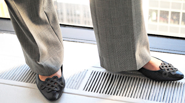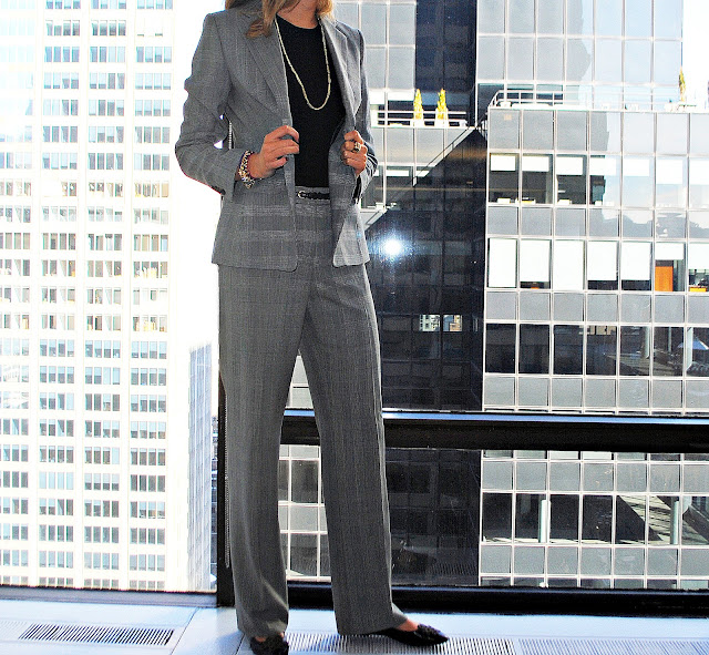 Suit: Brooks Brothers; Shell: Ann Taylor; Shoes: Diane Von Furstenberg Magnolia Flats; Belt: J. Crew; Necklace: Leslie Danzis; Bracelets: Lauren Ralph Lauren (Gold Chain), Colored Bracelets Available Upon Request; Ring: Kenneth Jay Lane (similar here)